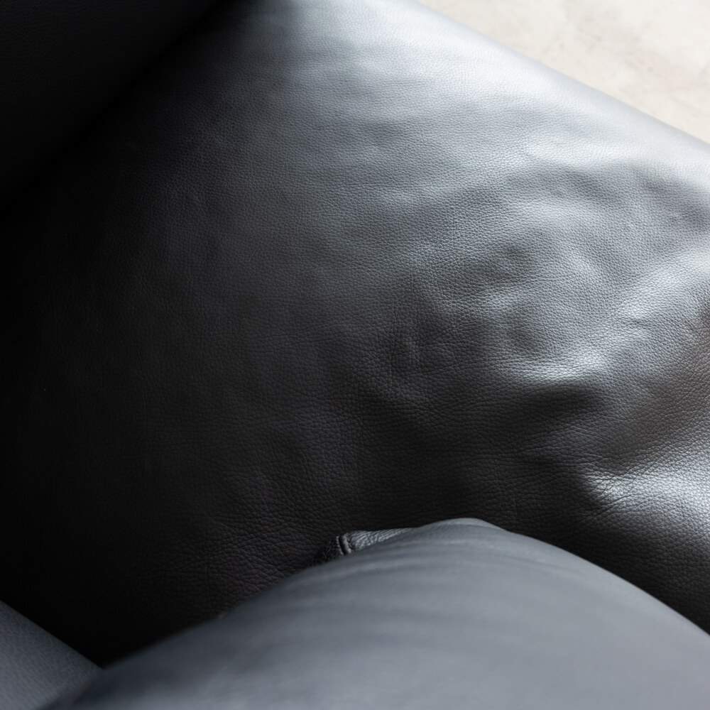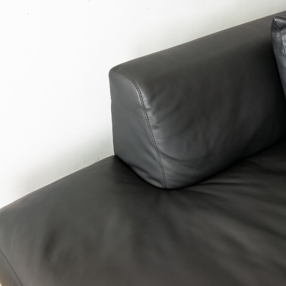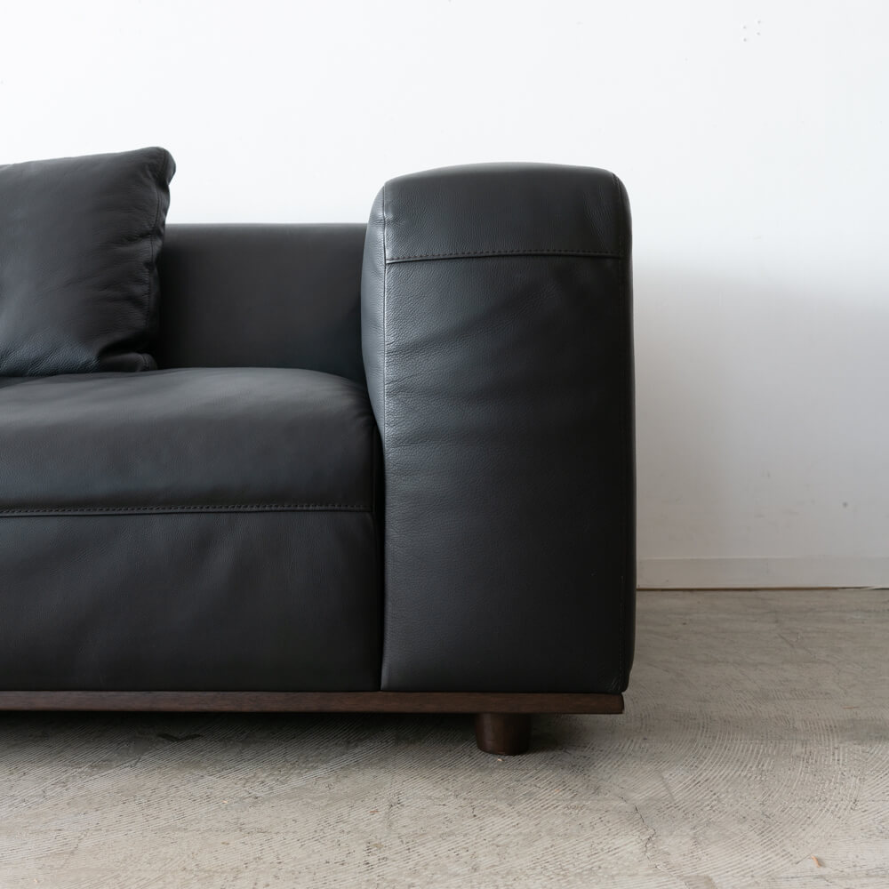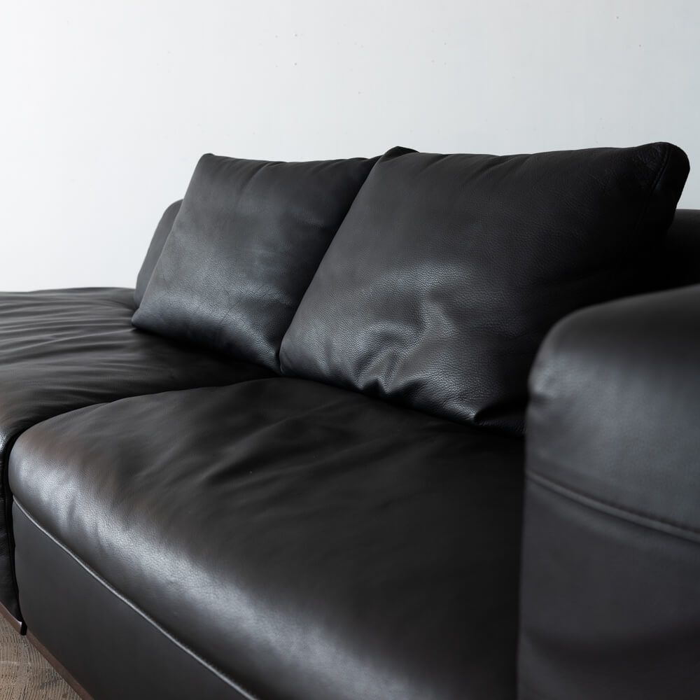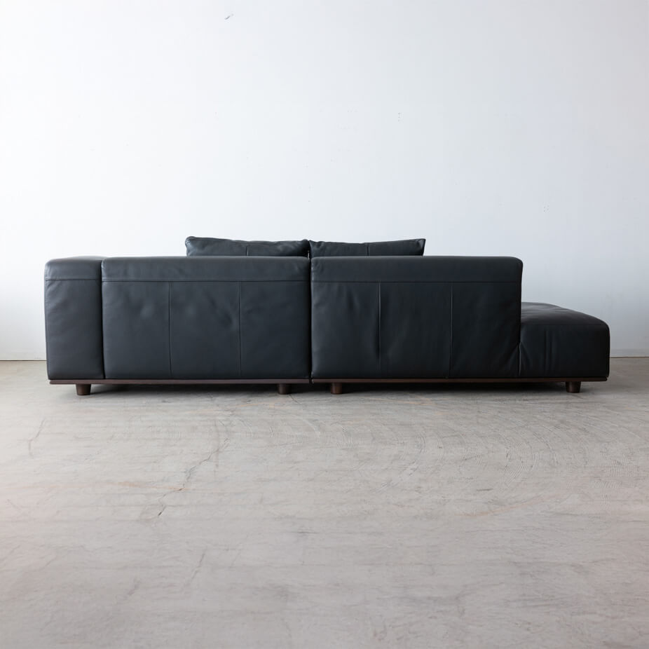 カウチRとカウチLを組み合わせたワイドな構成。座面はゆったりと奥行があり、身体を伸ばして横になることも可能。低めの背とアームが空間に圧迫感を与えず、広々としたリビングに調和します。