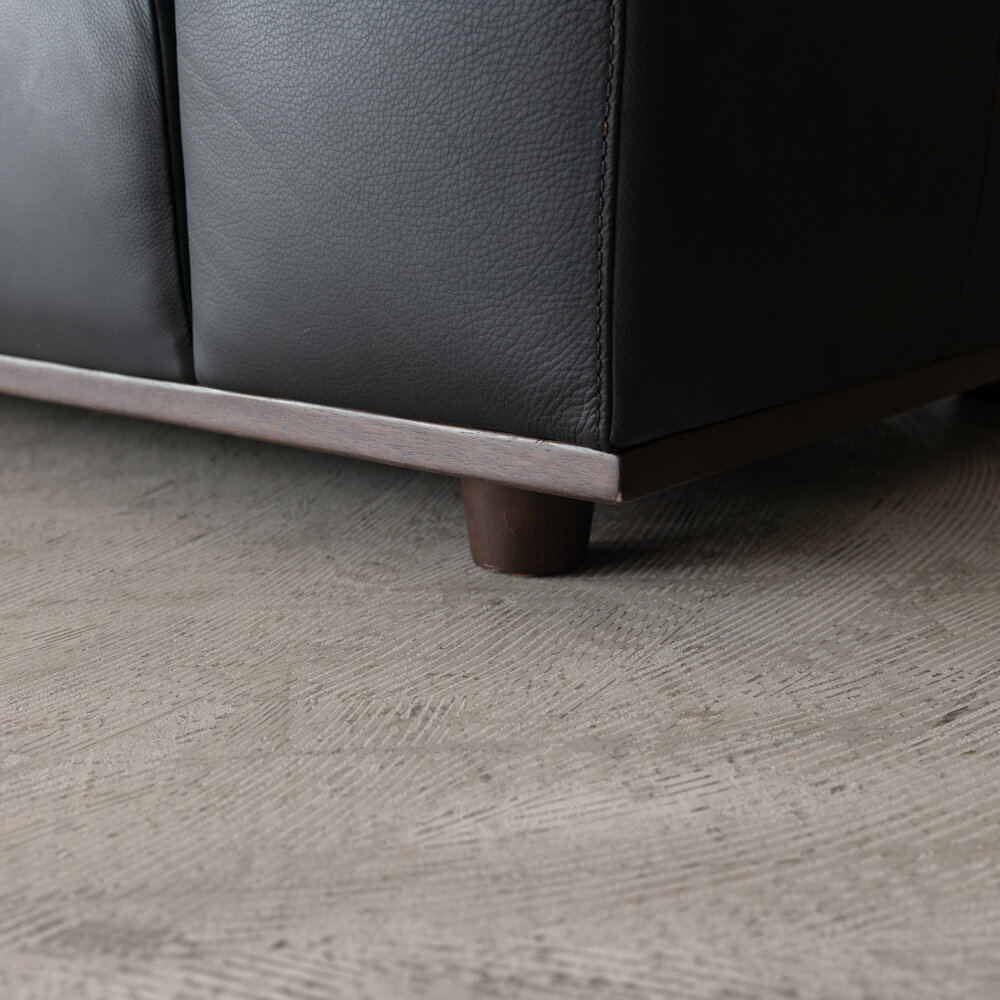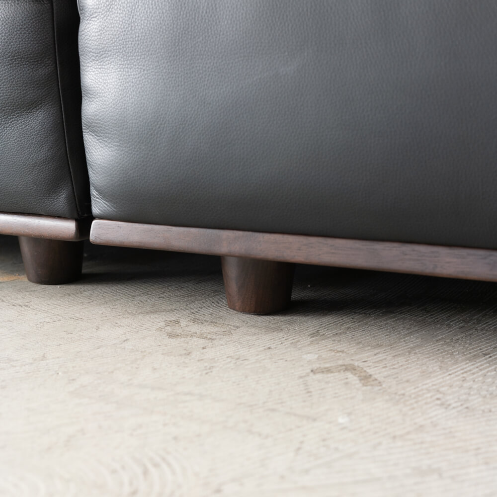 脚部にはホワイトアッシュ材(ウレタン樹脂塗装DB色)を採用。硬く耐久性に優れ、淡い木目に深い塗装色を合わせることで、革のブラックと美しいコントラストを描きます。モダンな印象を与えながらも、天然木ならではの温もりを感じさせてくれます。