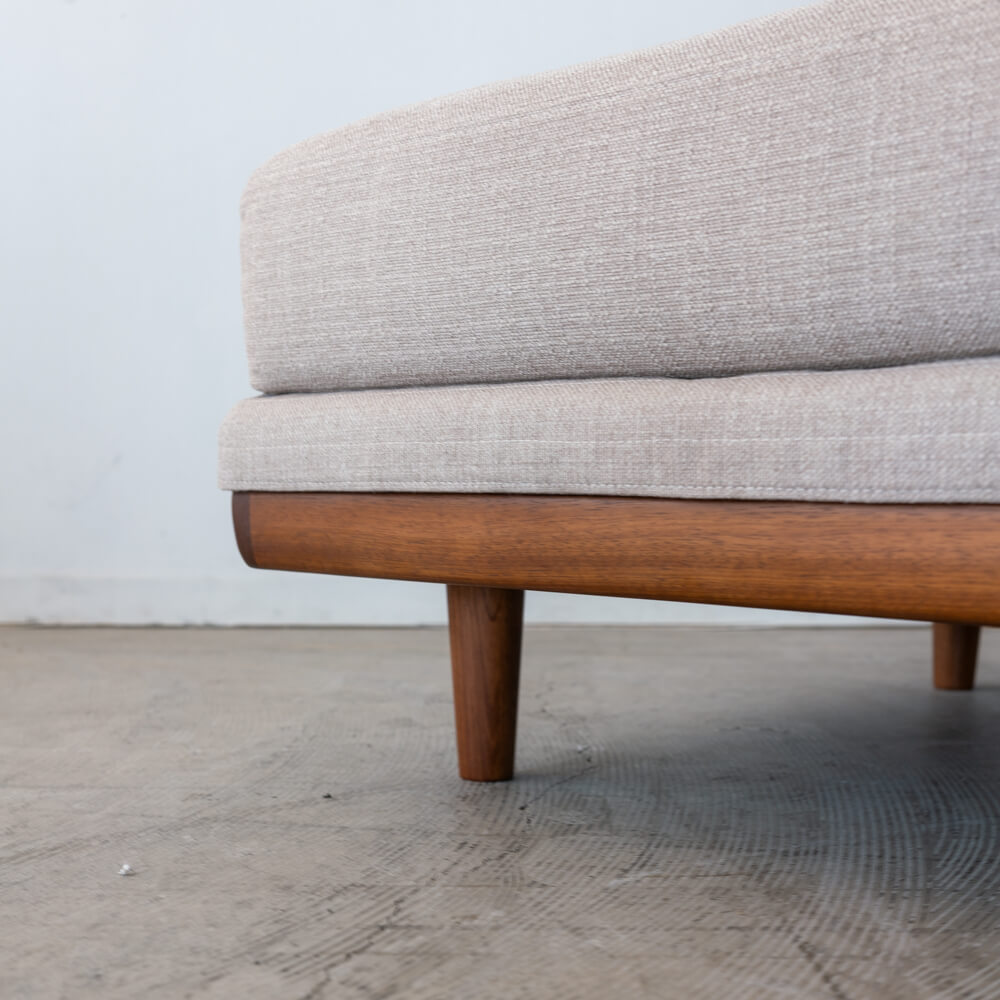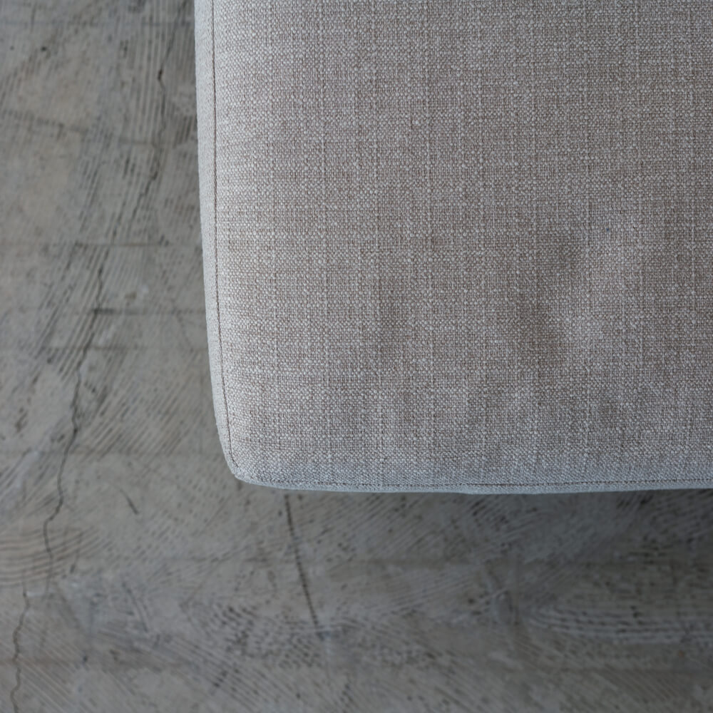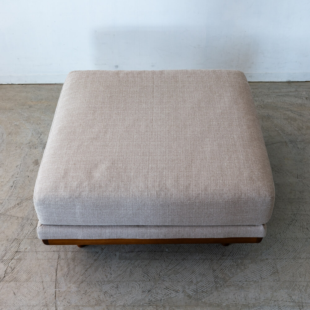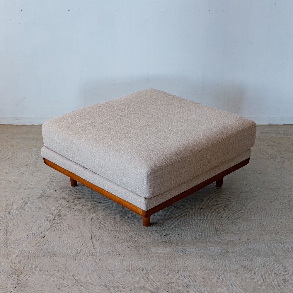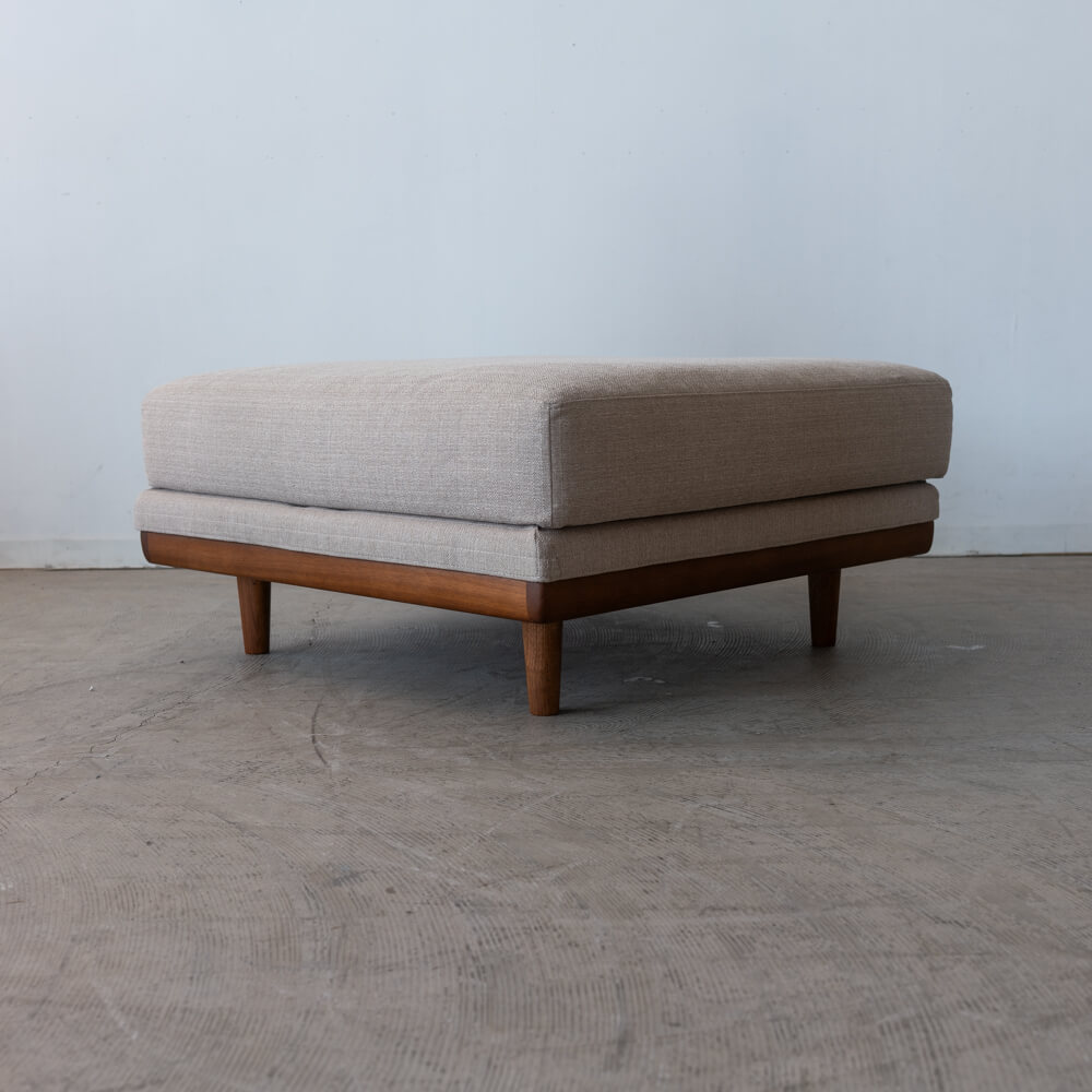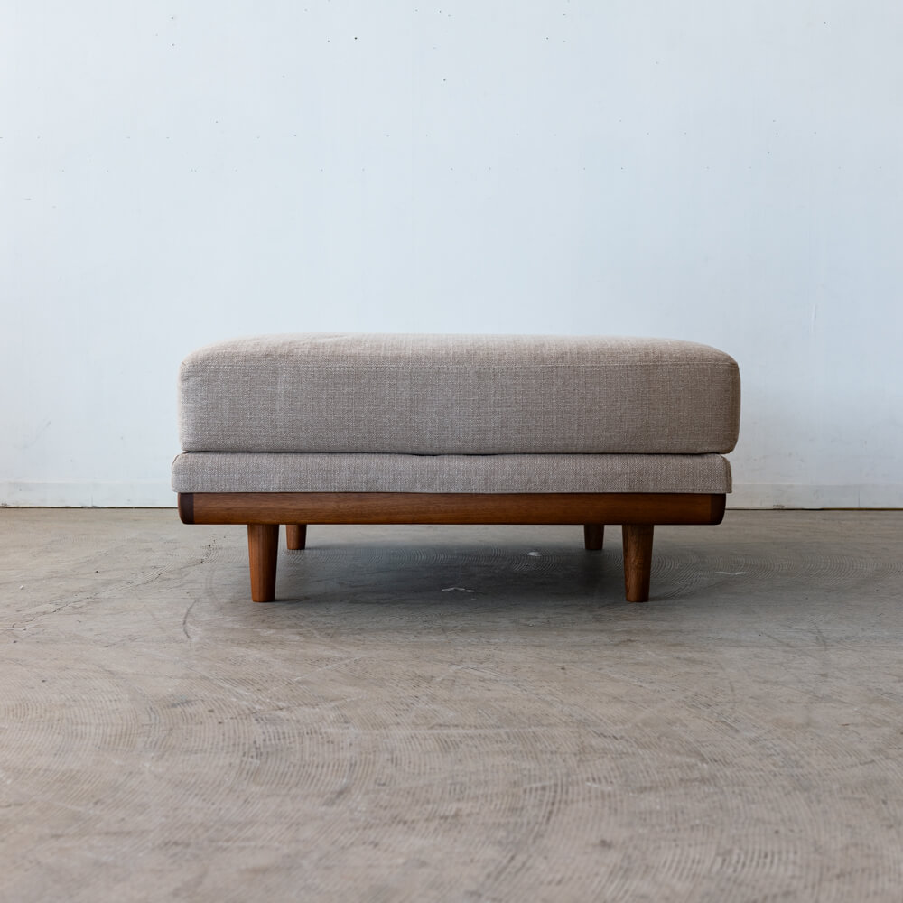 Crossoverシリーズのオットマン《SHOT》は、上質なファブリックと無垢のマホガニー脚が調和した一台。軽やかな佇まいながら、ゆったりとした座り心地を叶える設計で、ソファと合わせても、単体でも心地よく過ごせる万能な存在です。丁寧な木工技術と素材の質感が、リビングに穏やかなリズムを生み出します。