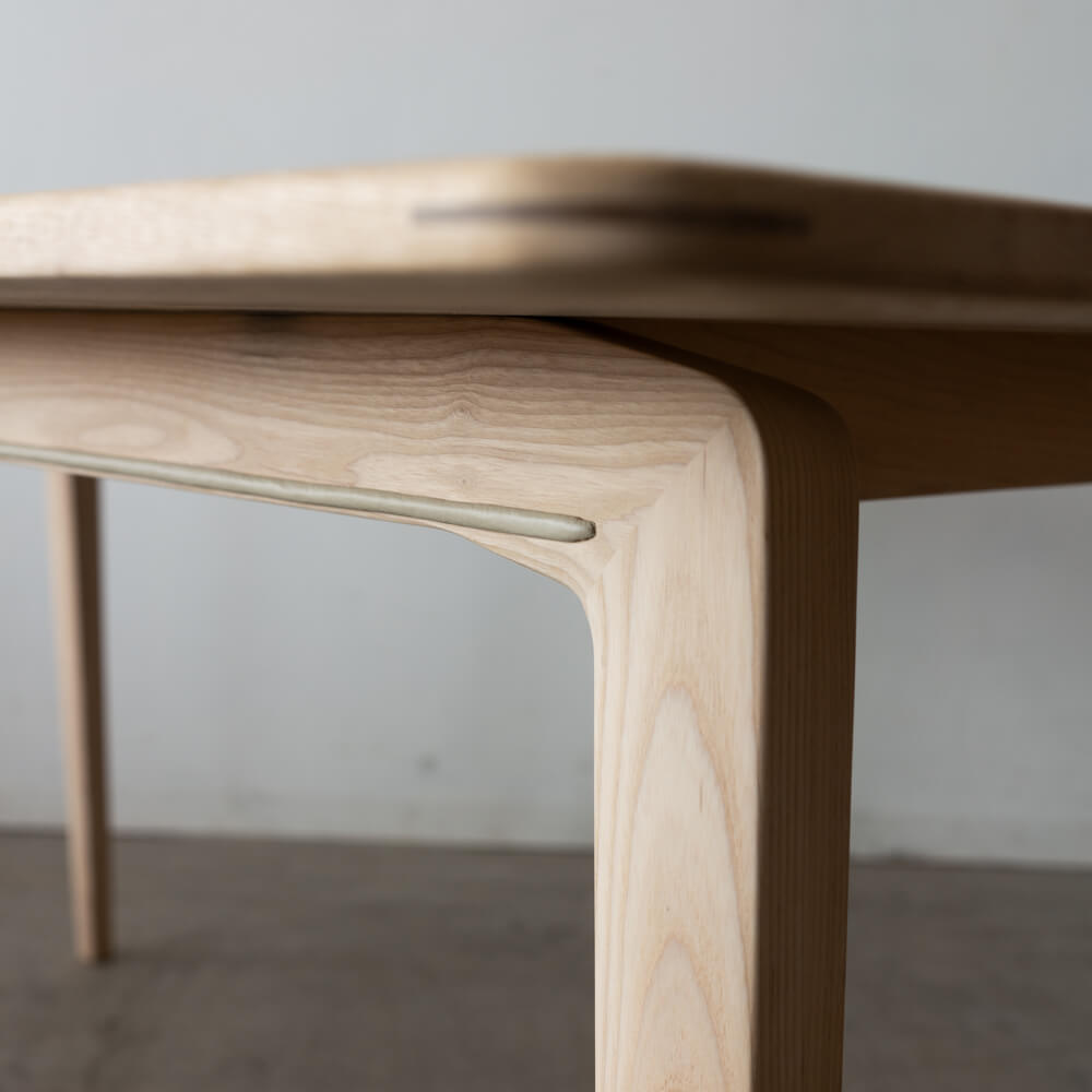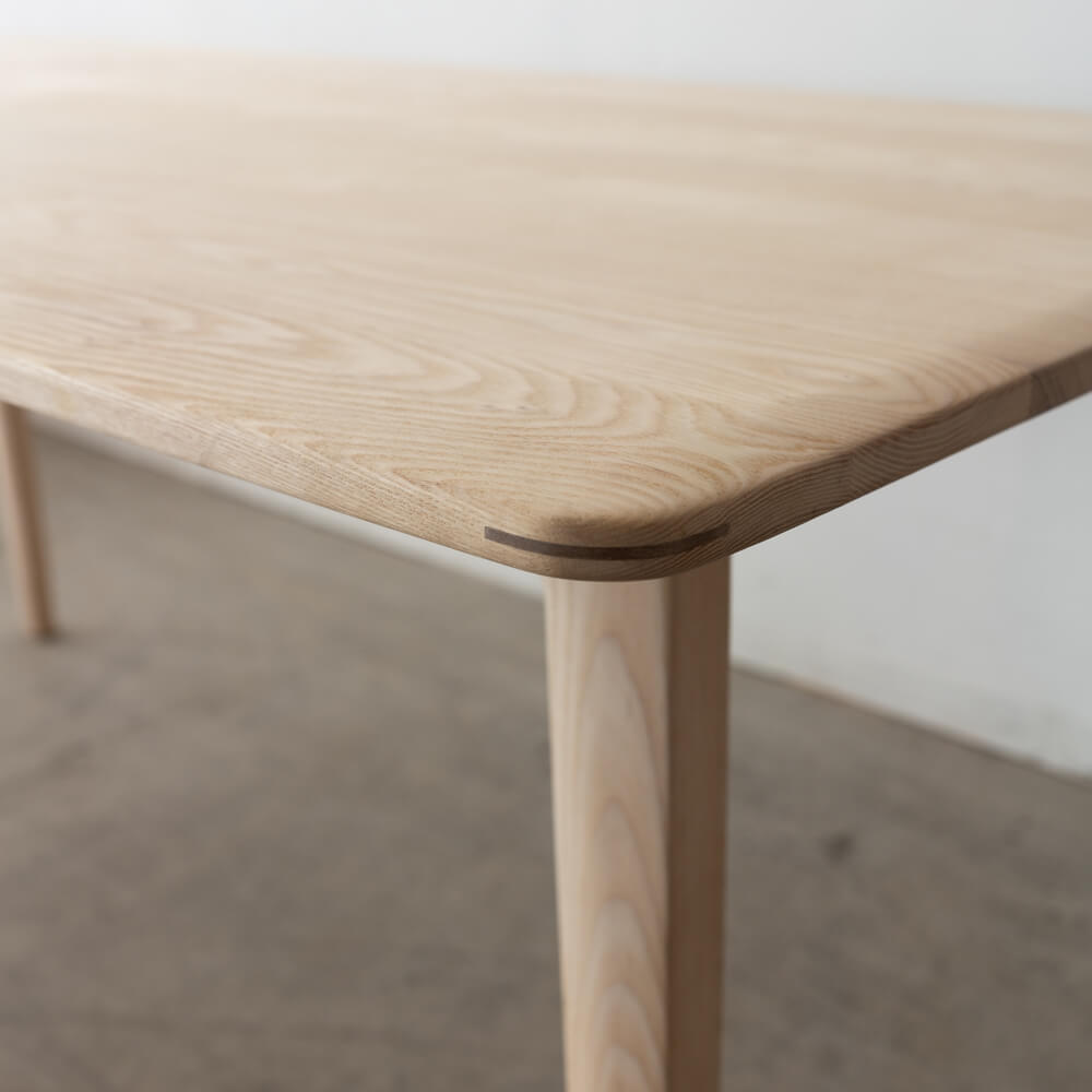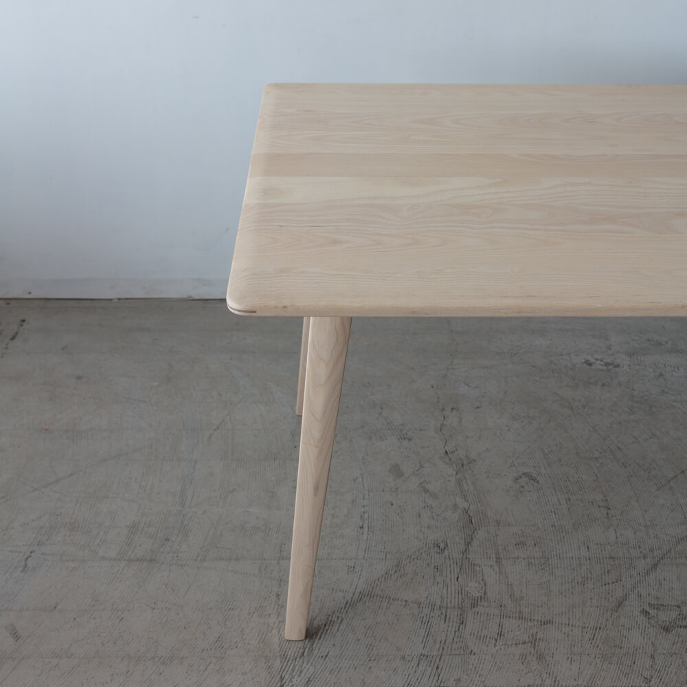 角度をもたせたテーパード脚が、軽やかな印象を与えながらもしっかりと安定感を確保。四隅の脚位置設計でチェアの出し入れもスムーズ。床との接地面には細やかな調整も可能です。