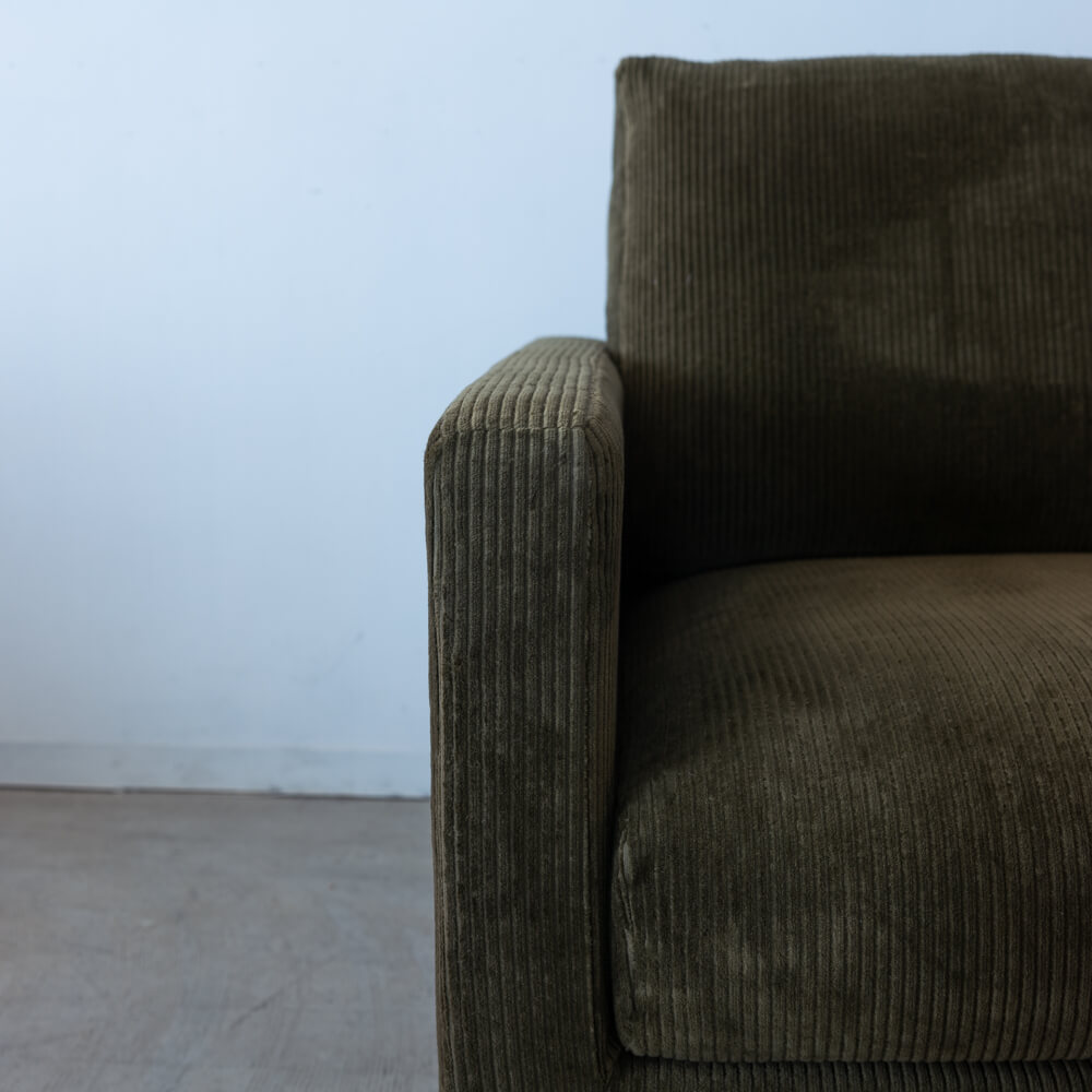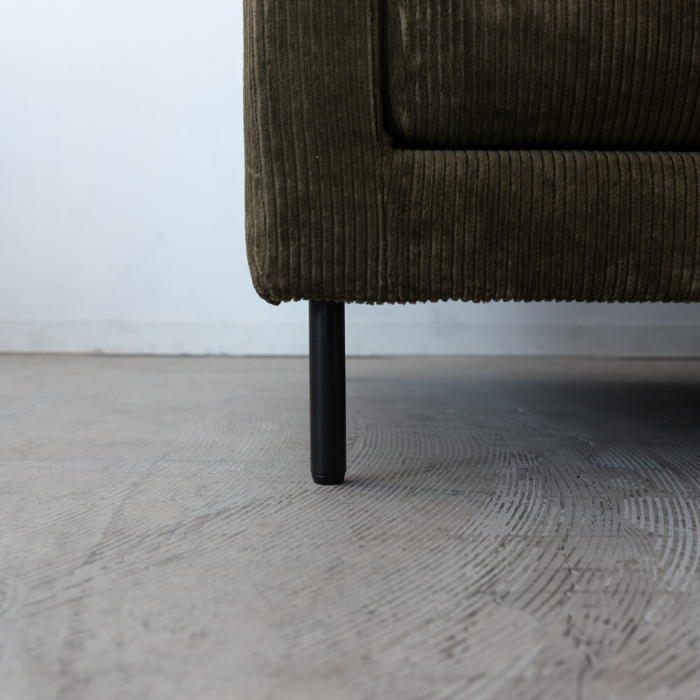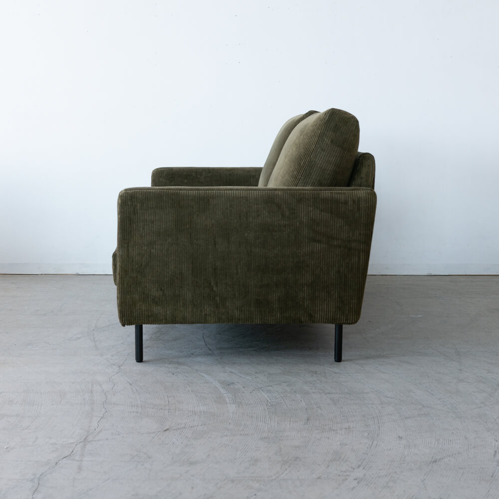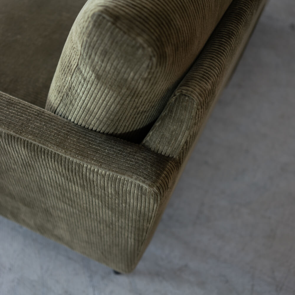 ユーカスのシリアルラインのもとに製作された、特別な試作品ソファ。落ち着きあるカーキ色とコーデュロイ生地の優しい肌触りが、上質なリラックスタイムを演出します。スチール脚が空間に軽やかさを添え、ナチュラルにもモダンにも溶け込むシンプルなデザインです。