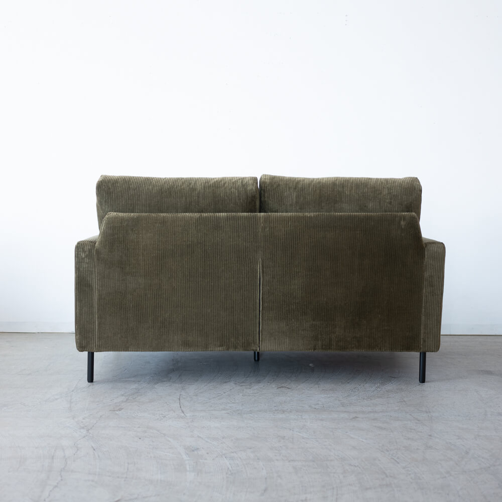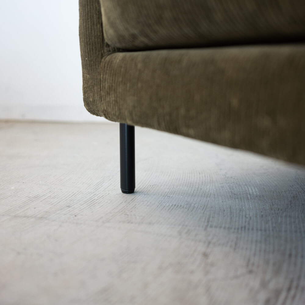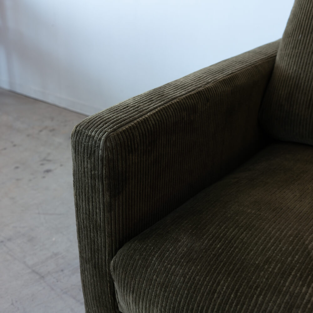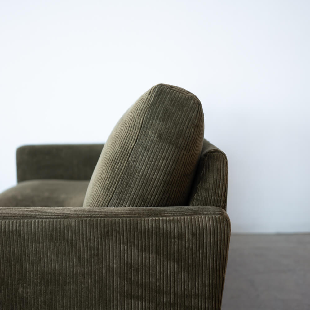 ユーカスのシリアルラインのもとに製作された、特別な試作品ソファ。落ち着きあるカーキ色とコーデュロイ生地の優しい肌触りが、上質なリラックスタイムを演出します。スチール脚が空間に軽やかさを添え、ナチュラルにもモダンにも溶け込むシンプルなデザインです。