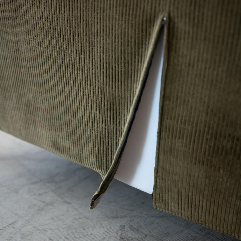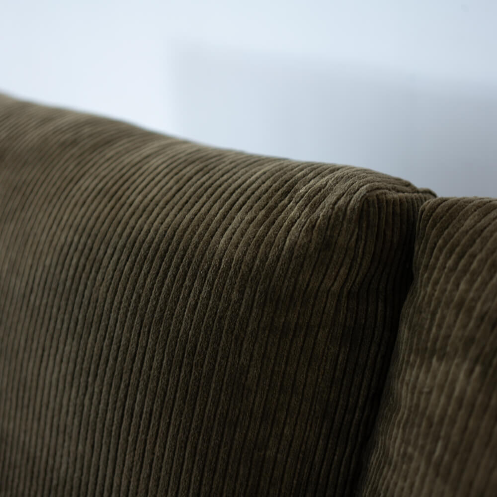 表面素材にはコットン100%のコーデュロイ生地を採用。立体的なウネの表情が光の角度によって変化し、深みのある印象を与えます。やわらかな手ざわりで、季節を問わず快適に過ごせます。