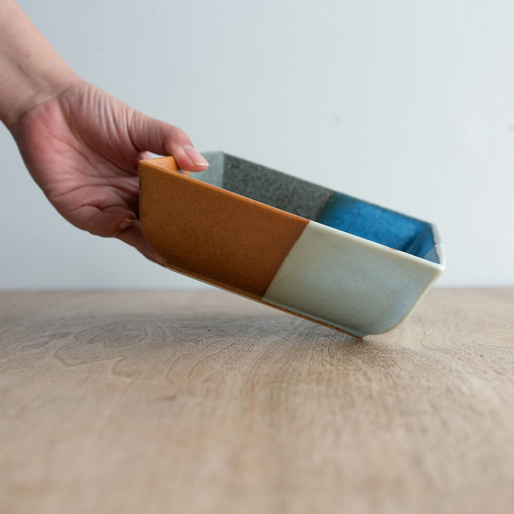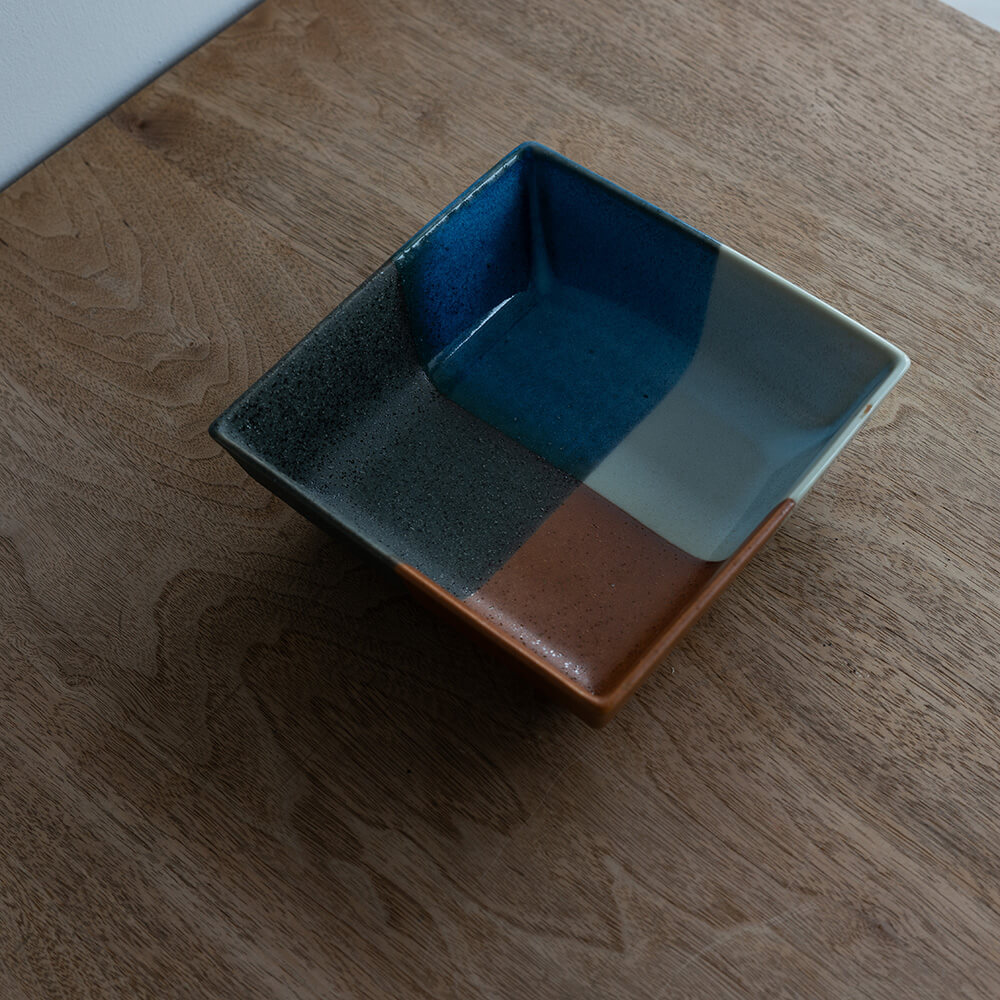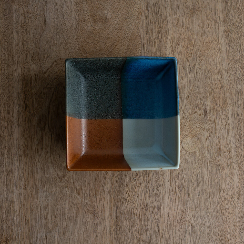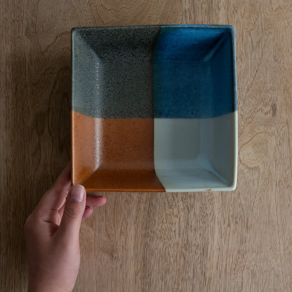 落ち着きのある藍色、やわらかな生成り、渋みのある黒、温かみを感じる赤茶——。4色の釉薬を丁寧に塗り分けた角鉢です。マットと艶感のコントラストが美しく、テーブルに置くだけで食卓がぱっと華やぎます。和洋問わず、さまざまな料理を引き立てる存在感が魅力です。