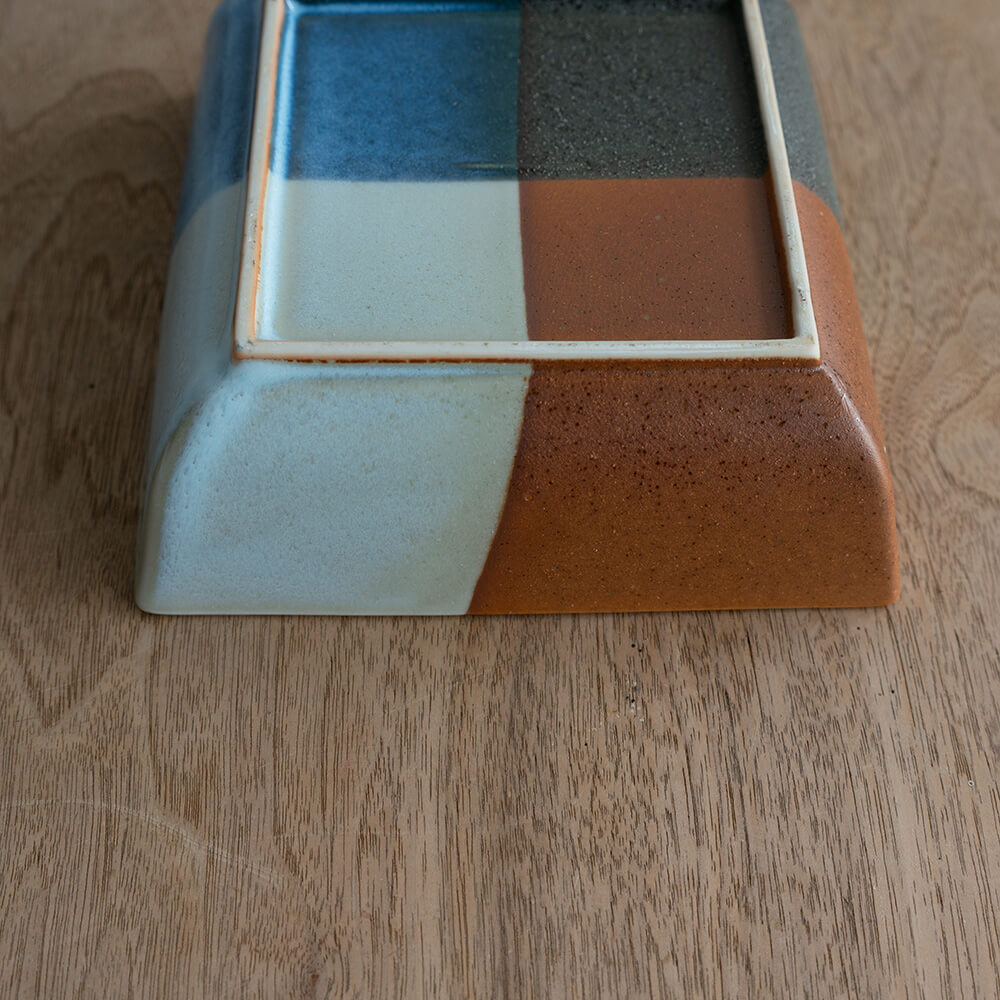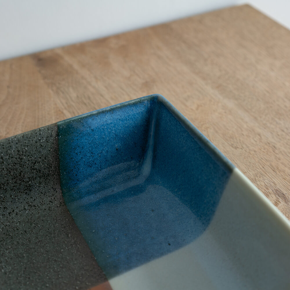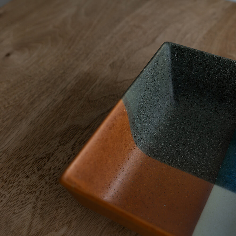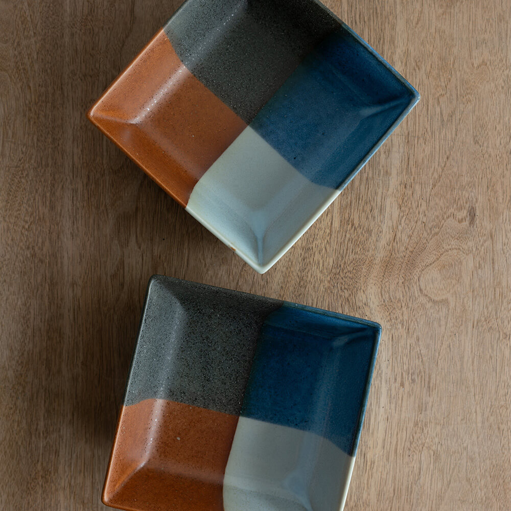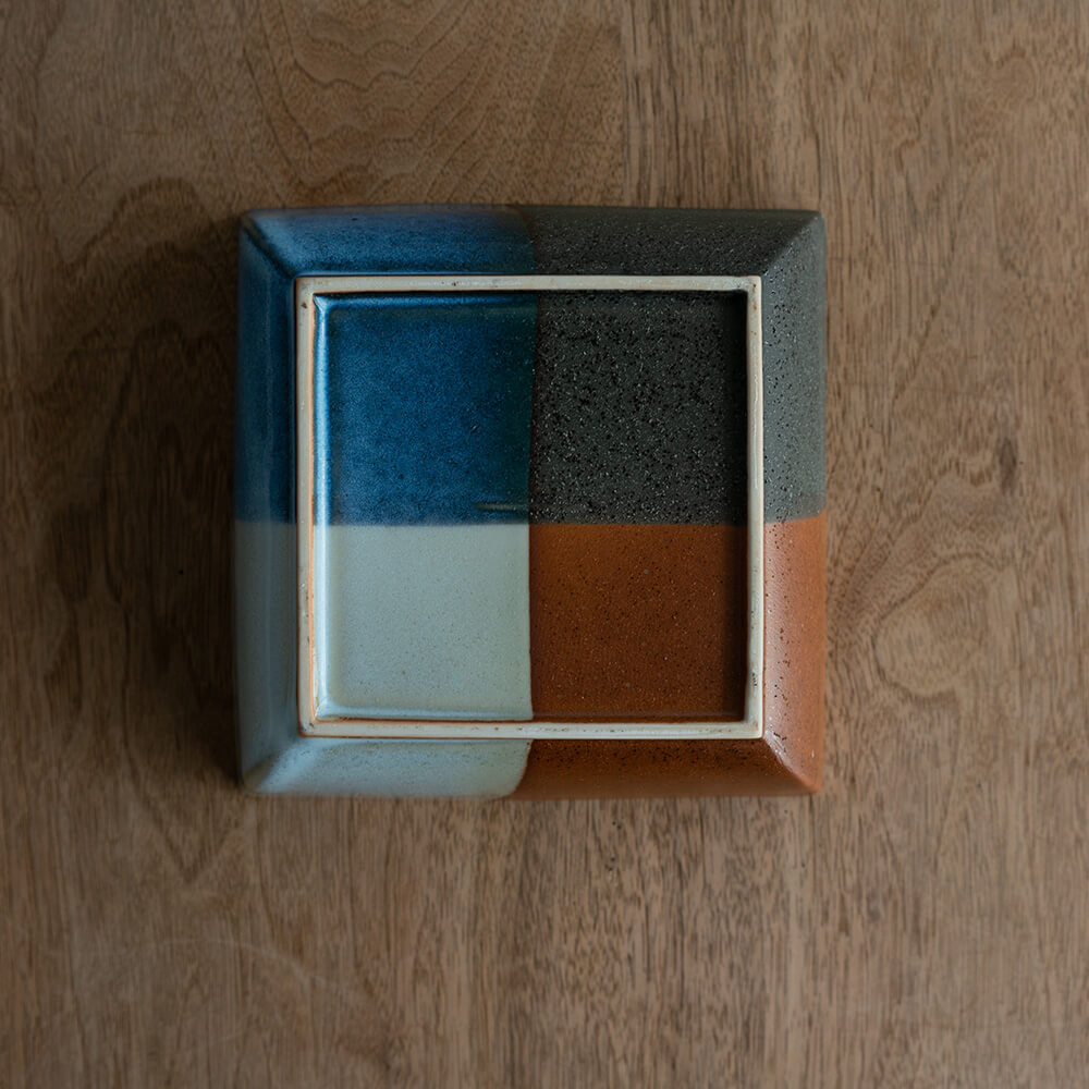 落ち着きのある藍色、やわらかな生成り、渋みのある黒、温かみを感じる赤茶——。4色の釉薬を丁寧に塗り分けた角鉢です。マットと艶感のコントラストが美しく、テーブルに置くだけで食卓がぱっと華やぎます。和洋問わず、さまざまな料理を引き立てる存在感が魅力です。