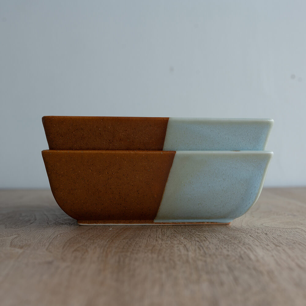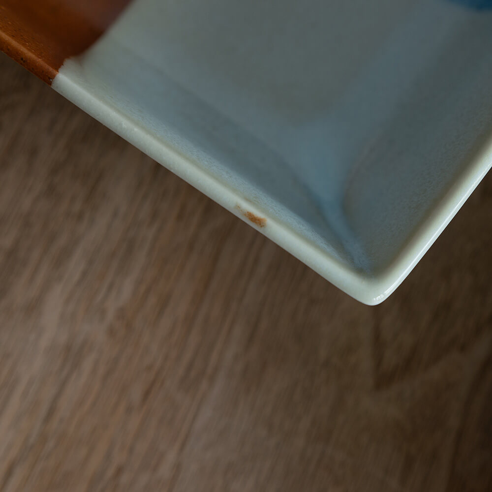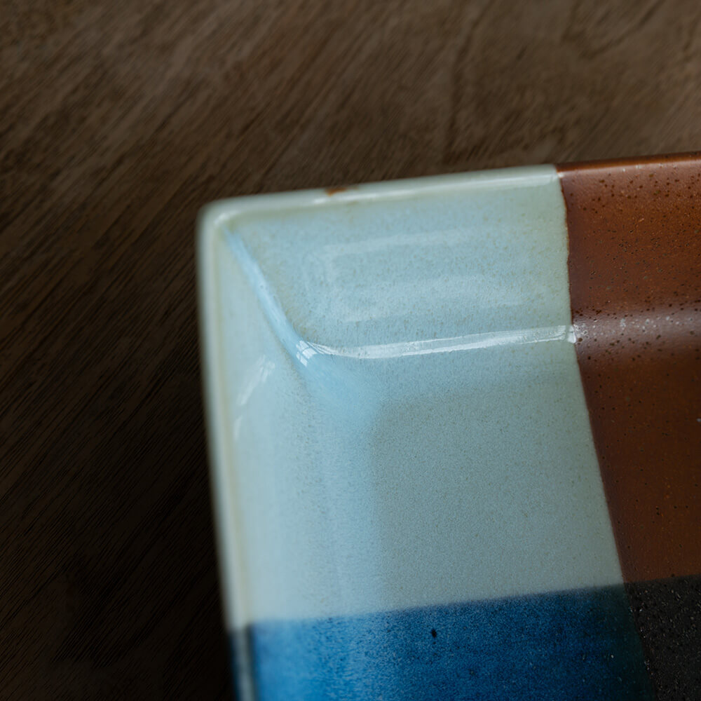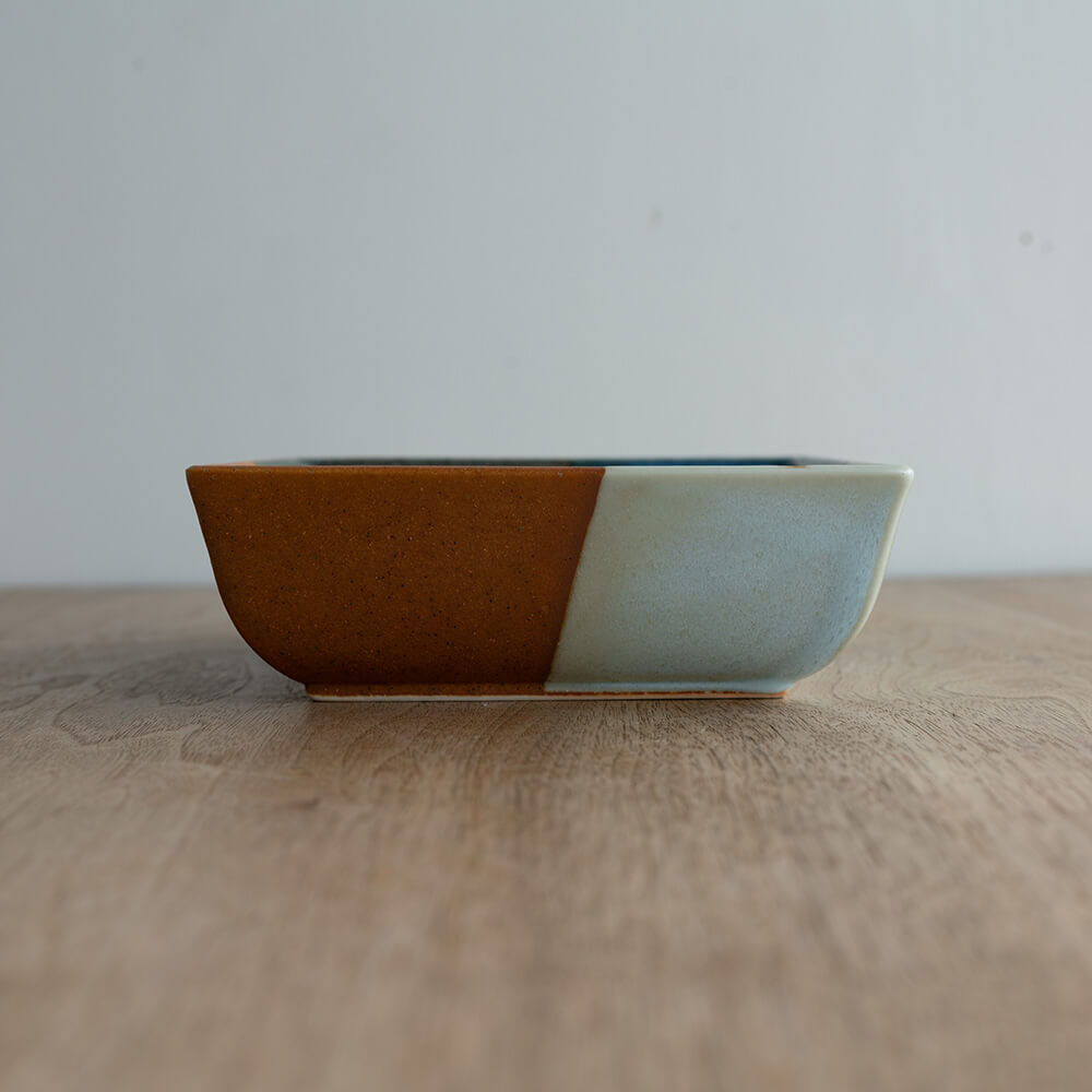 落ち着きのある藍色、やわらかな生成り、渋みのある黒、温かみを感じる赤茶——。4色の釉薬を丁寧に塗り分けた角鉢です。マットと艶感のコントラストが美しく、テーブルに置くだけで食卓がぱっと華やぎます。和洋問わず、さまざまな料理を引き立てる存在感が魅力です。