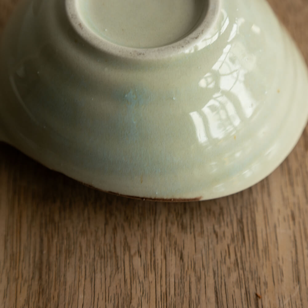 この器のいちばんの魅力は、うっすらと青みを帯びたグリーンのうのふ釉。角度によって淡い青にも淡緑にも見える絶妙な色合いで、白い料理もカラフルな食材も美しく引き立てます。焼成によって一つひとつ表情が異なり、光をやわらかく受け止める落ち着いた佇まいです。
