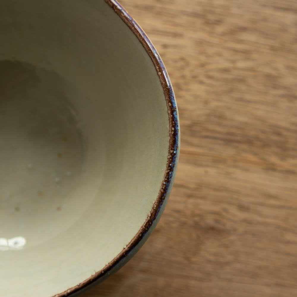 縁には茶色の釉薬が施され、全体の淡い色味をきりりと引き締めています。この「口紅」と呼ばれる技法は、素朴な器に深みを与える伝統的な装飾。細部にまで職人のこだわりが感じられます。