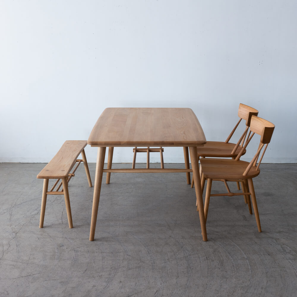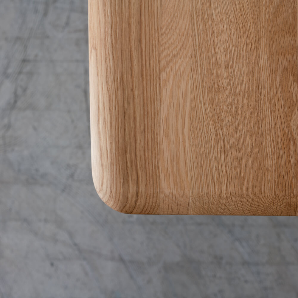 天板やベンチの角はすべてなめらかな曲線で仕上げられており、小さなお子さまのいるご家庭でも安心。シンプルな造形の中に、丁寧な木工技術が息づいています。