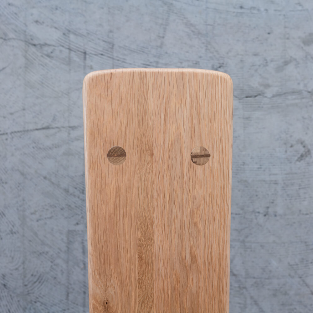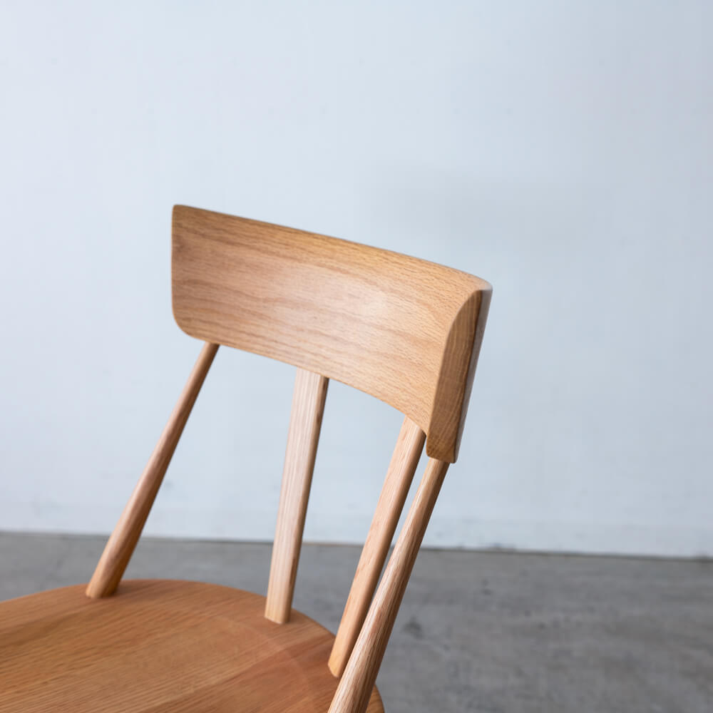背あたり部(笠木)には無垢材を曲げ加工し、身体に自然に沿うやさしいカーブを実現。裏面には鉄プレートを仕込み、板座の割れを防ぐ工夫が施されています。軽量設計のため、掃除や模様替えの際にも片手で持ち上げやすく、日常使いにぴったりです。