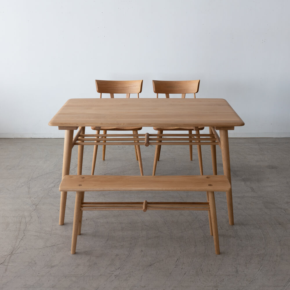 テーブル幅はW125cm。チェア2脚+ベンチの組み合わせは、限られたスペースでも軽やかに配置できる省スペース設計。リビングダイニングを広く見せたい方にもおすすめです。