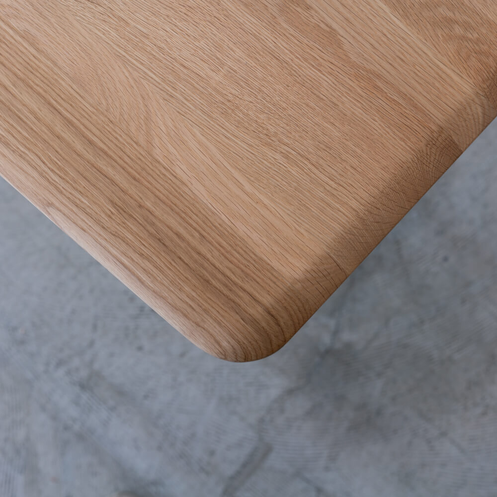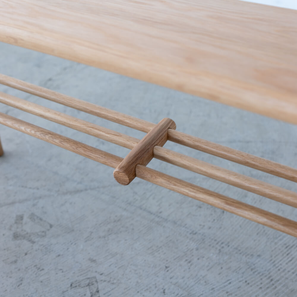 天板やベンチの角はすべてなめらかな曲線で仕上げられており、小さなお子さまのいるご家庭でも安心。シンプルな造形の中に、丁寧な木工技術が息づいています。