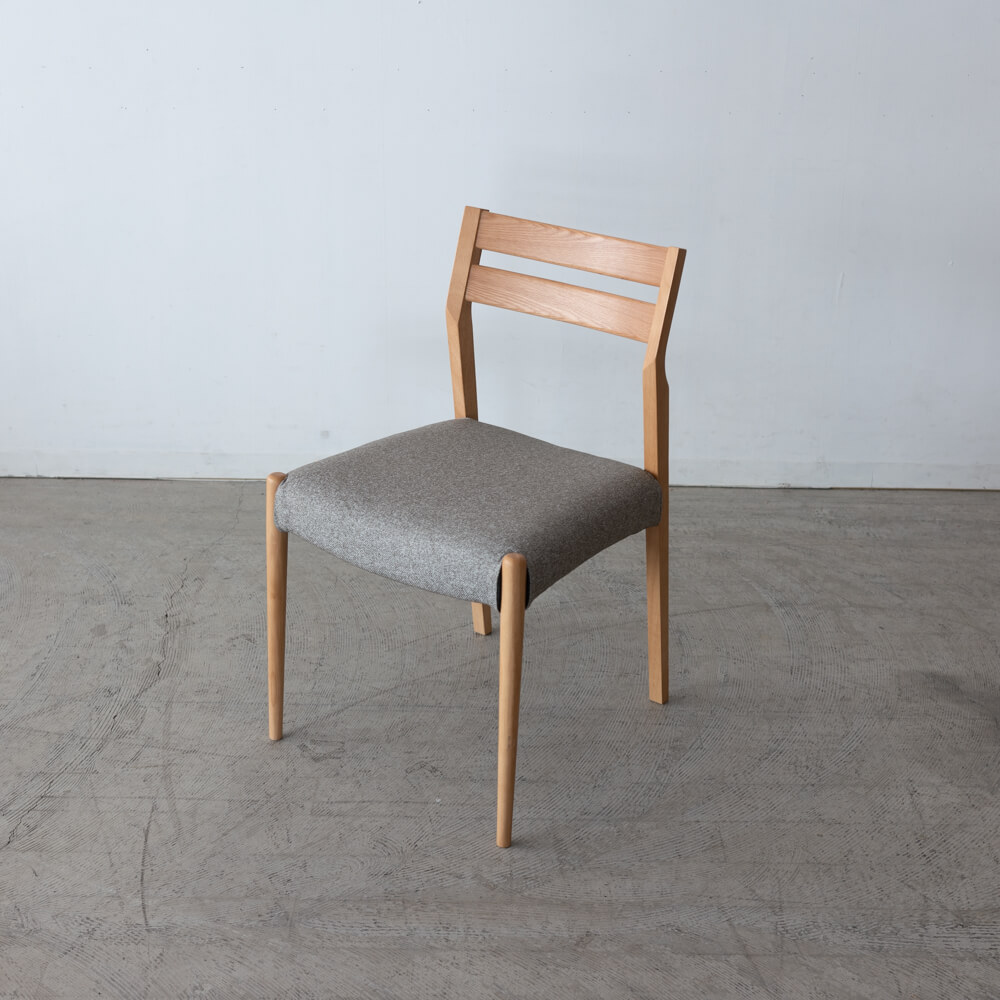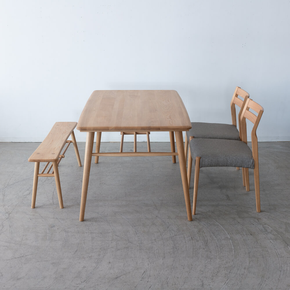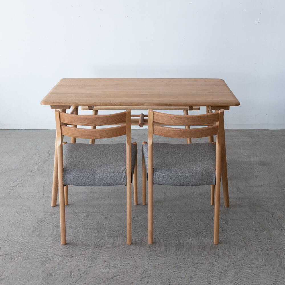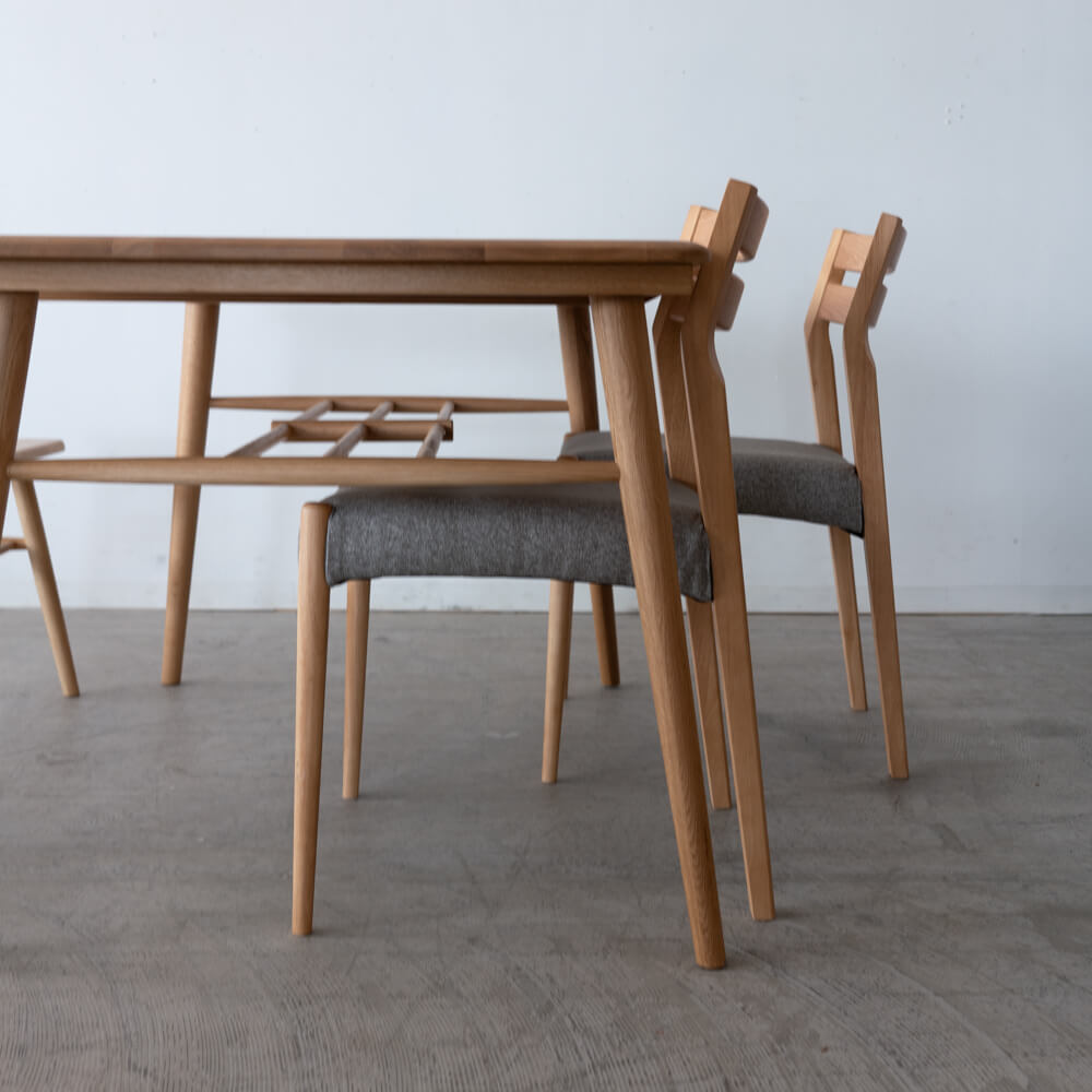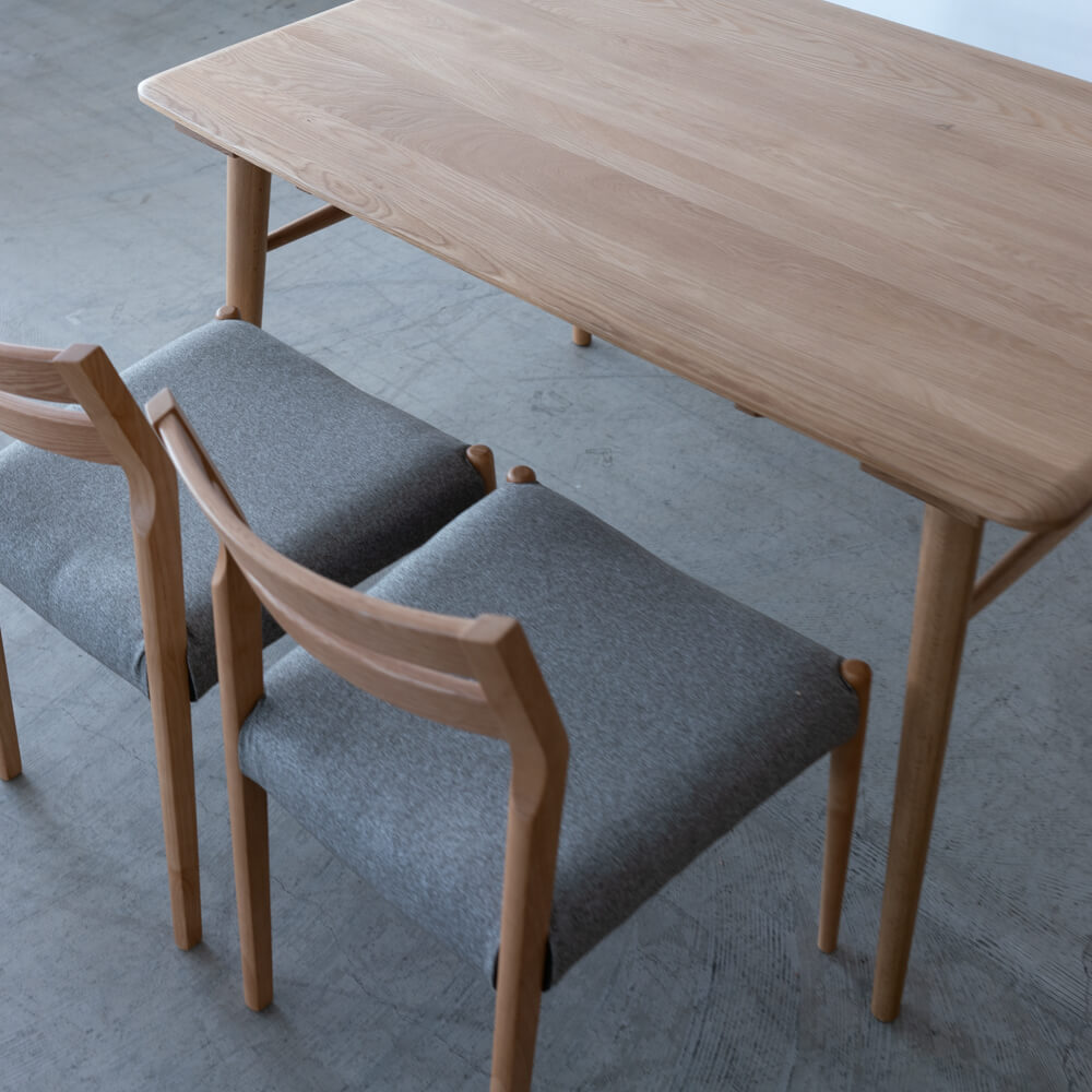 セットのチェアには、エースチェアを組み合わせています。ホワイトオークとラバーウッドの軽やかなフレームに、グレーのファブリック座面を合わせることで、ナチュラルな木部とのバランスが美しく、幅広いインテリアに馴染みます