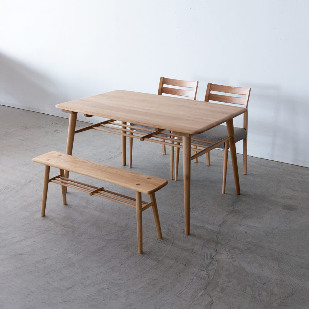 テーブル幅はW125cm。チェア2脚+ベンチの組み合わせは、限られたスペースでも軽やかに配置できる省スペース設計。リビングダイニングを広く見せたい方にもおすすめです。