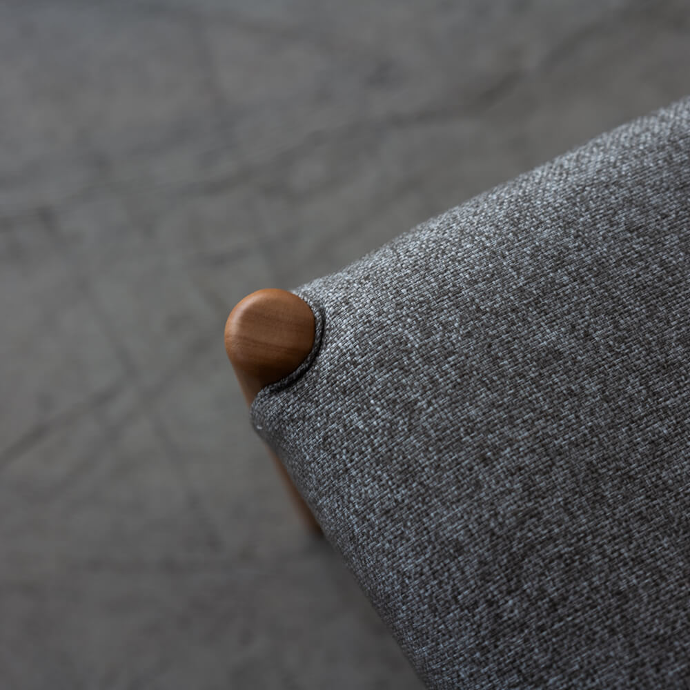 。グレーのファブリック座面は張り込み仕様となっています。乾いた布、または固く絞った柔らかい布で拭いてお手入れをしてください。