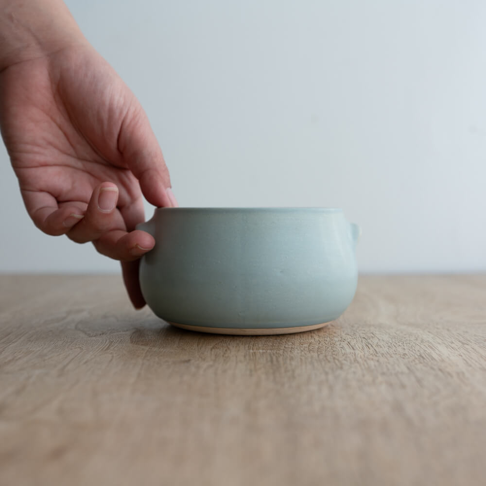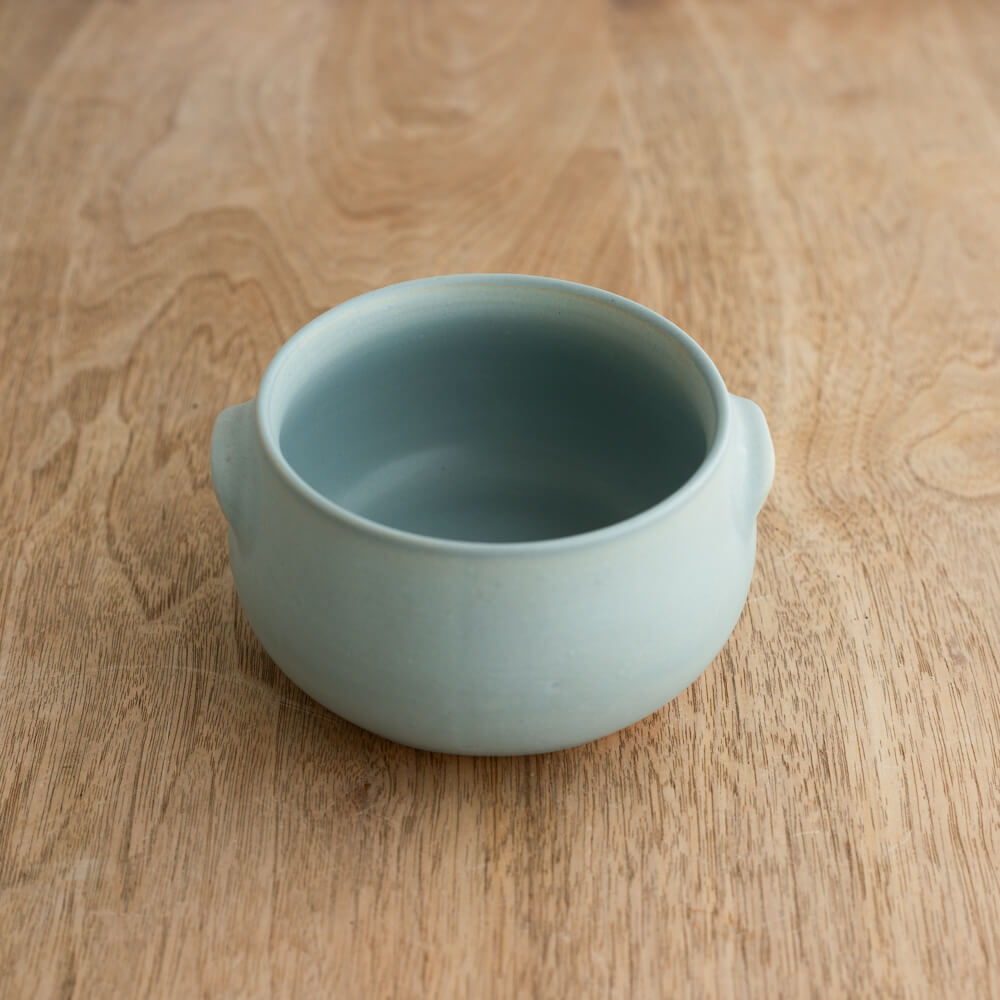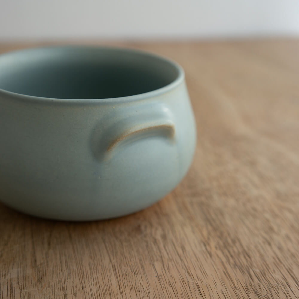 ころんとした形と、両サイドの小さな“耳”がこの器のチャームポイント。持ちやすく、スープをよそうときやテーブルへの運びも安心。手のひらにすっぽりと収まるサイズ感は、使うたび心地よさを感じさせます。