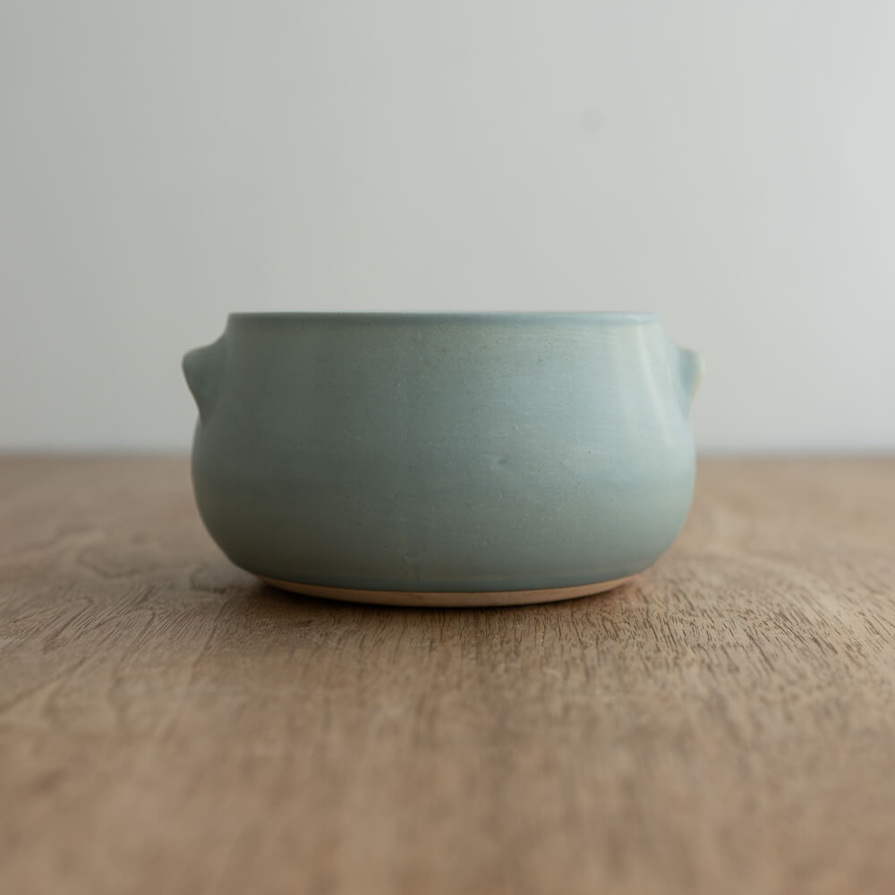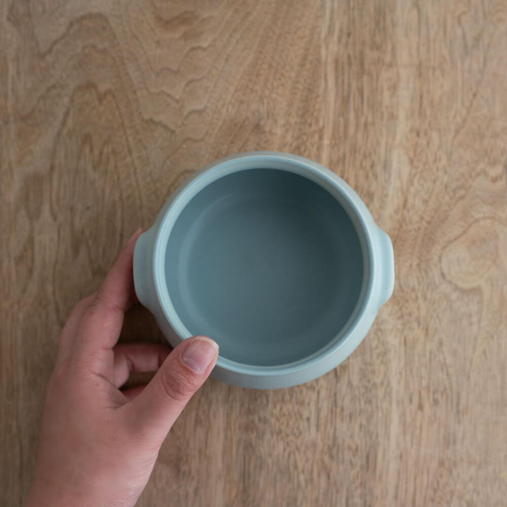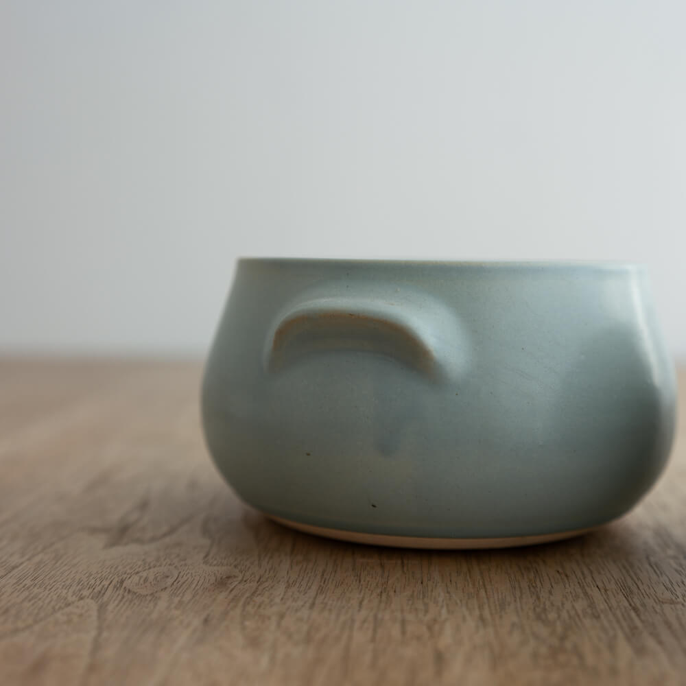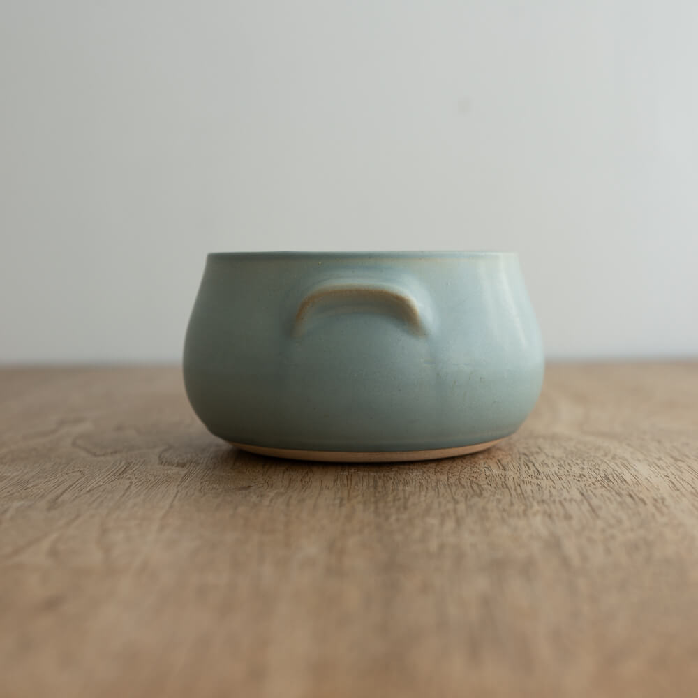 ころんとした形と、両サイドの小さな“耳”がこの器のチャームポイント。持ちやすく、スープをよそうときやテーブルへの運びも安心。手のひらにすっぽりと収まるサイズ感は、使うたび心地よさを感じさせます。