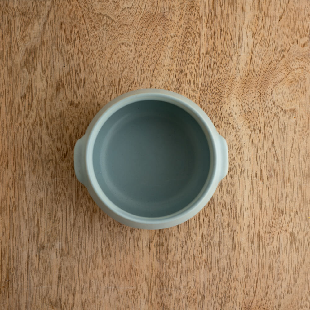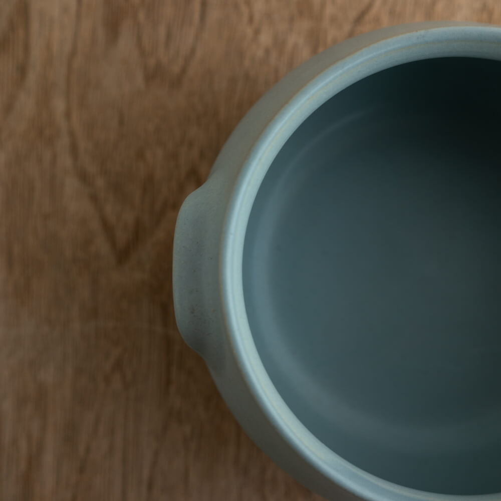 A. 一番の魅力は、「やさしさが伝わるフォルムと色」。丸みを帯びた形と小さな“耳”がぬくもりを感じさせ、淡いブルーグレーの色合いが冬の食卓をやわらかく包み込みます。料理の色味を引き立て、インテリアの一部のように自然に馴染む存在です。
