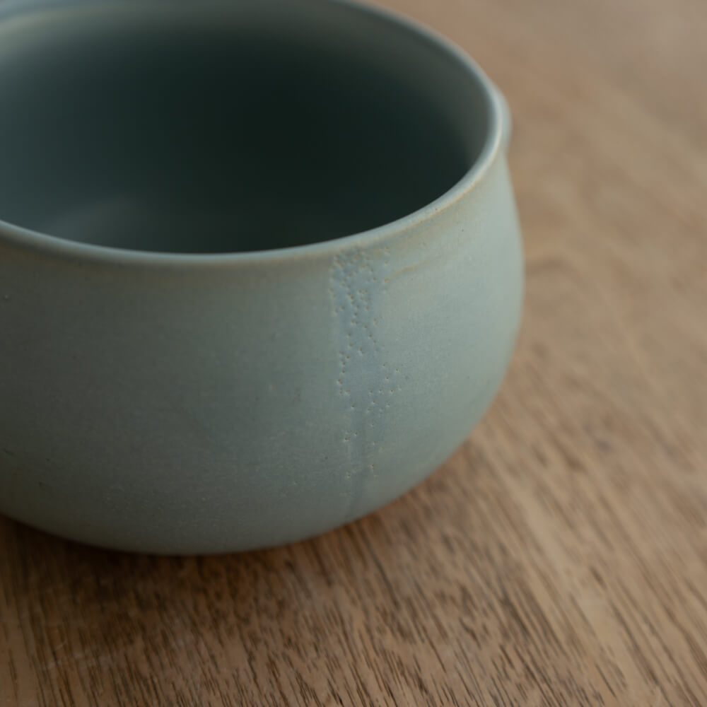 やわらかなブルーグレーのマット釉が、料理の色味をふんわりと引き立てます。光の加減でやさしくトーンが変わる表情は、見ているだけで心がほっとほどけるよう。指先になじむさらりとした手触りが、冬のあたたかな時間をより豊かにしてくれます。