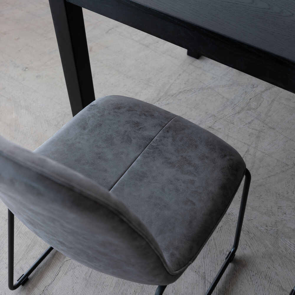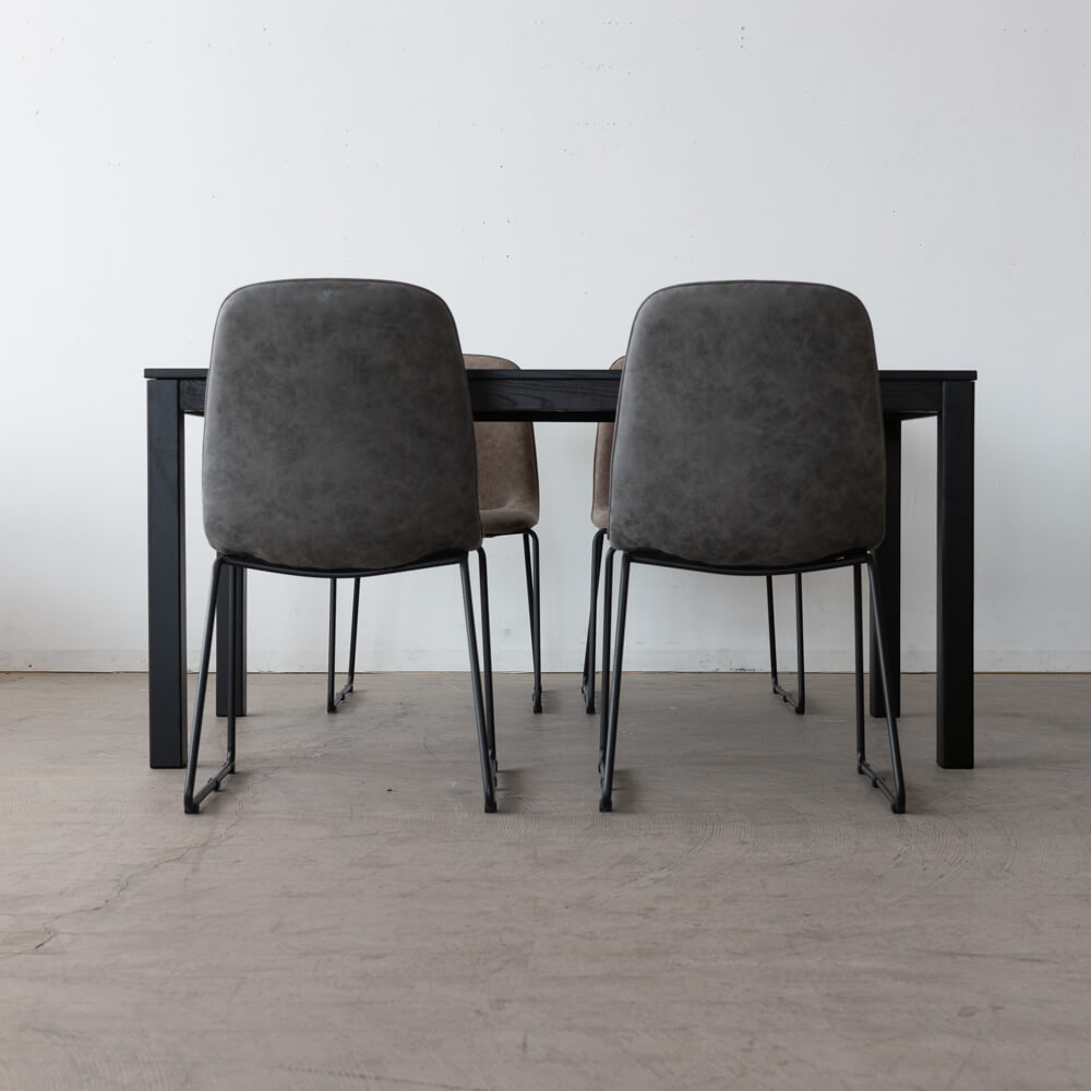 チェアの張地には、グレーとライトブラウンのPUレザーを採用。異なる色味を2脚ずつ組み合わせることで、シンプルな空間にも奥行きと動きをプラスします。粉黛塗装を施したスチール脚が、軽やかで都会的な印象を添えます。