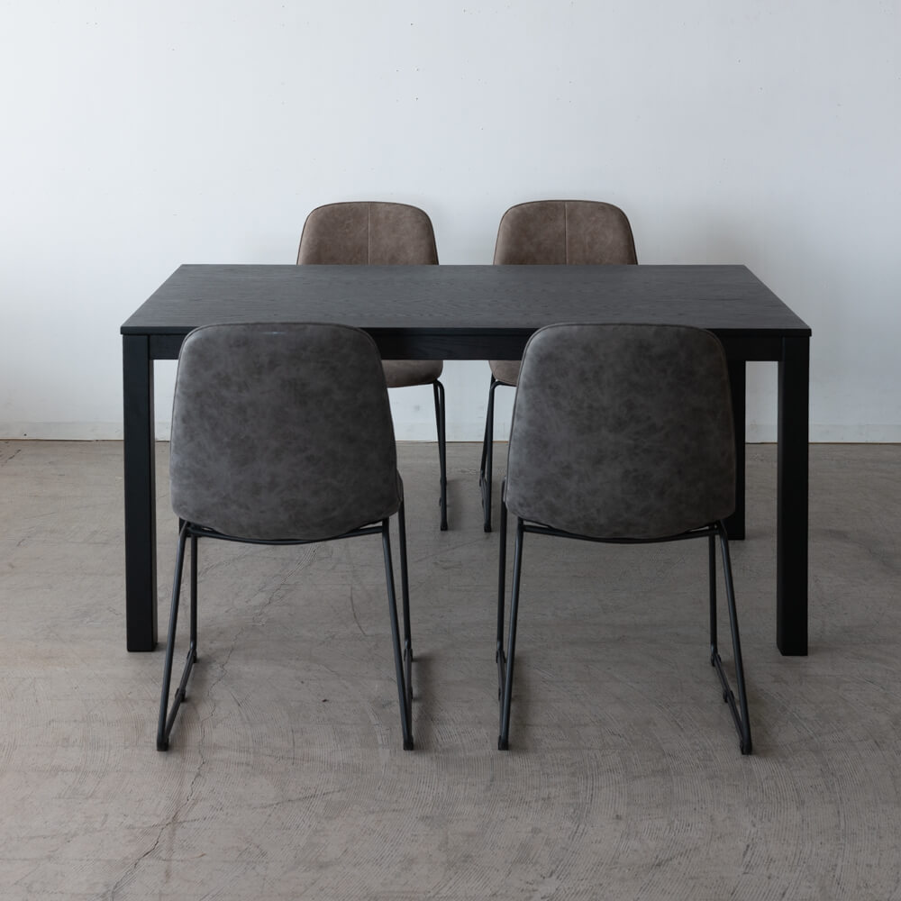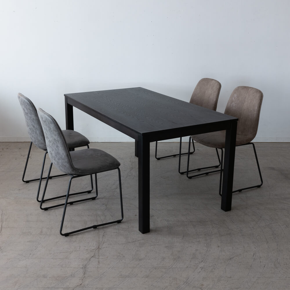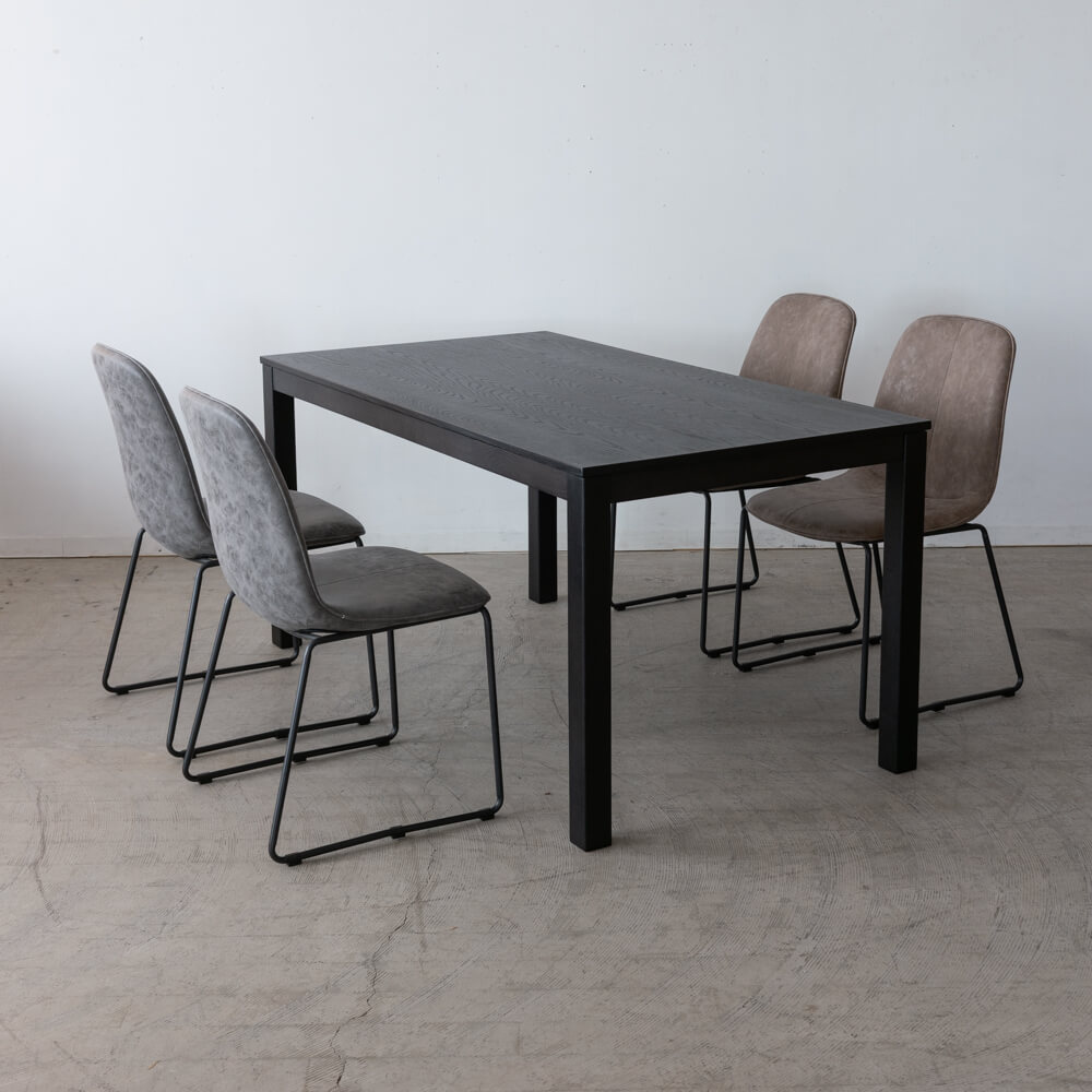 ブラックオークのシャープなテーブルに、グレーとライトブラウンのレザーチェアを組み合わせたモダンダイニングセット。異素材と2色の組み合わせが空間に奥行きを生み、落ち着いた雰囲気の中にスタイリッシュな印象をプラスします。直線的なデザインとシックなトーンで、暮らしをモダンに引き締めるダイニングセットです。