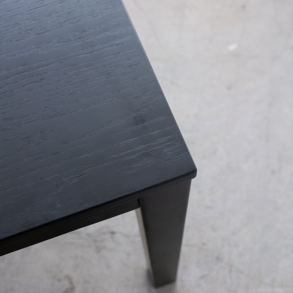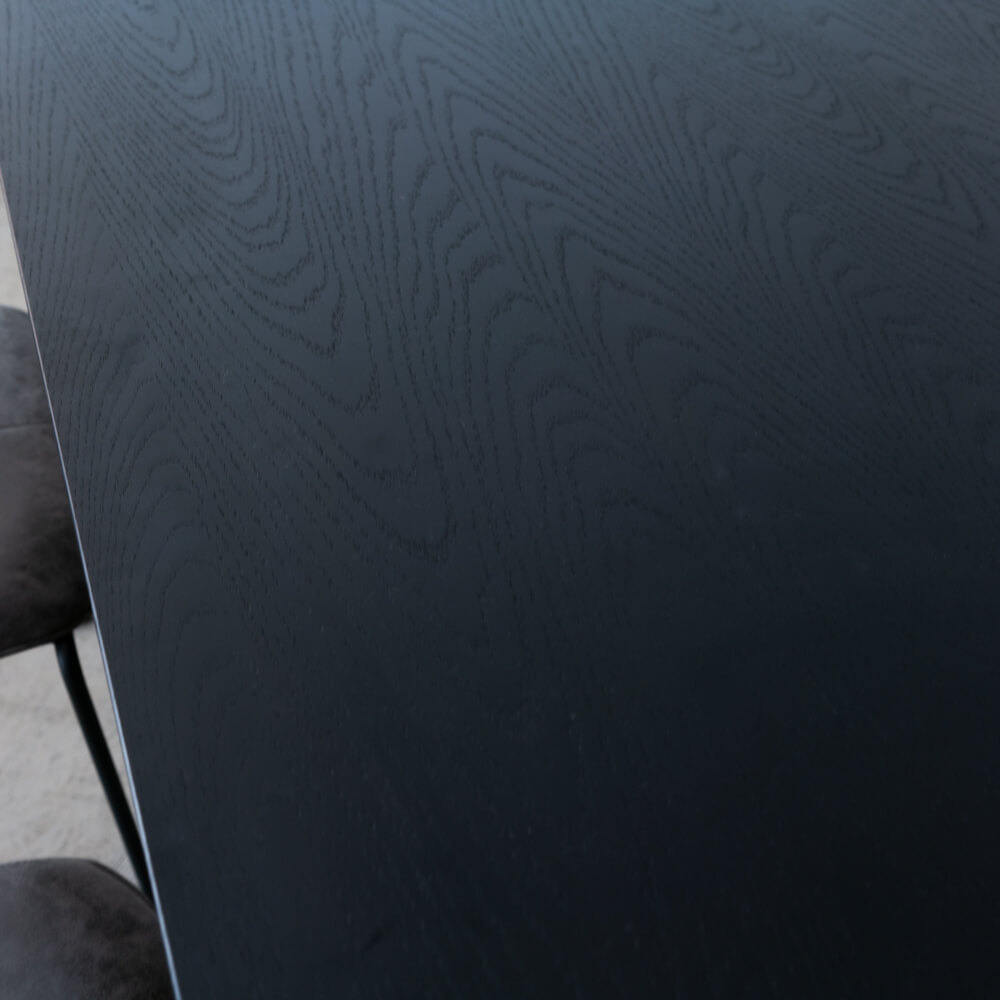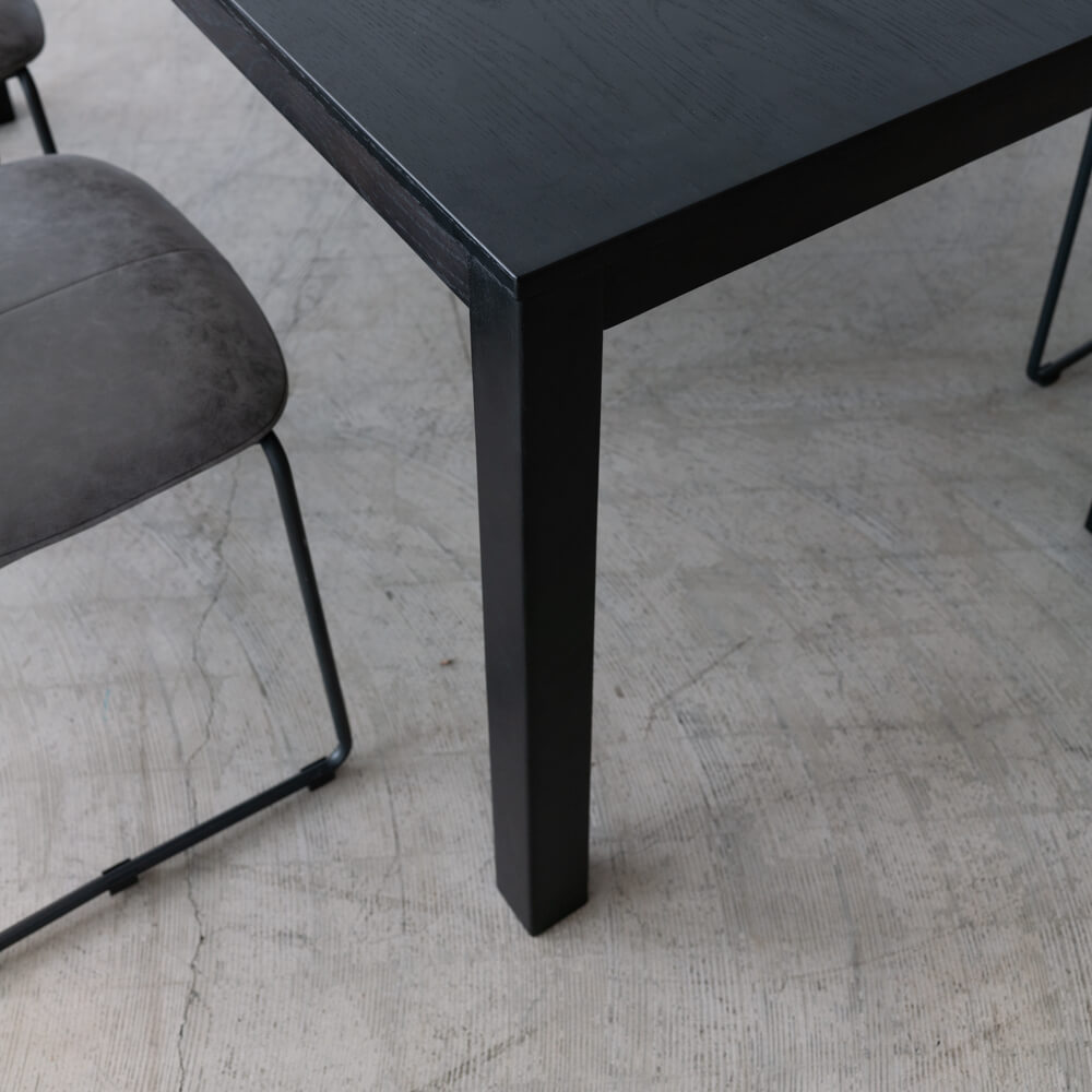 テーブルの天板には天然化粧繊維板、脚部には天然木(オーク)を採用。マットなブラックのウレタン塗装仕上げが、木の表情を活かしながらもモダンな印象を引き立てます。アイアンではなく木脚を使うことで、空間を冷たくしすぎず程よい温もりを残します。