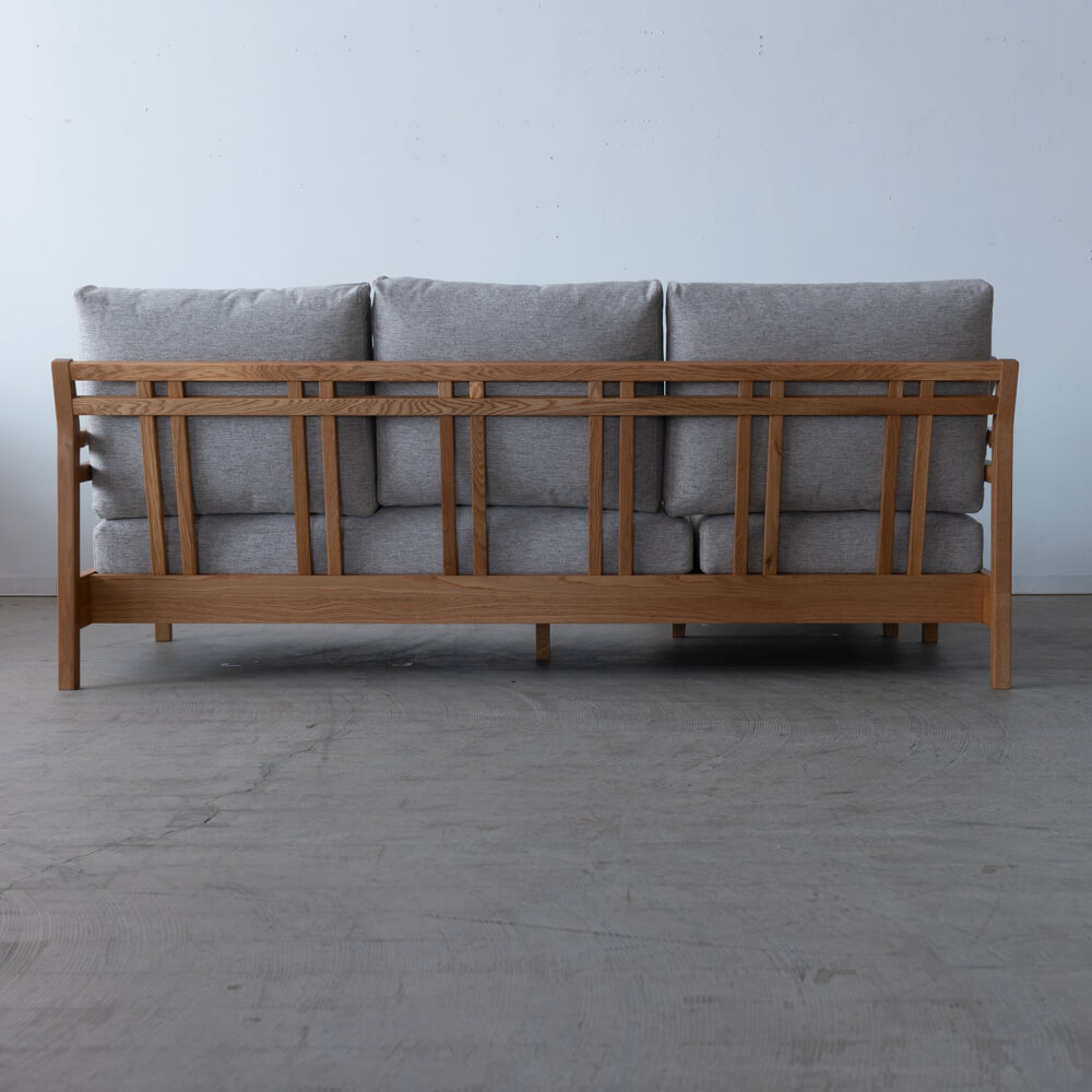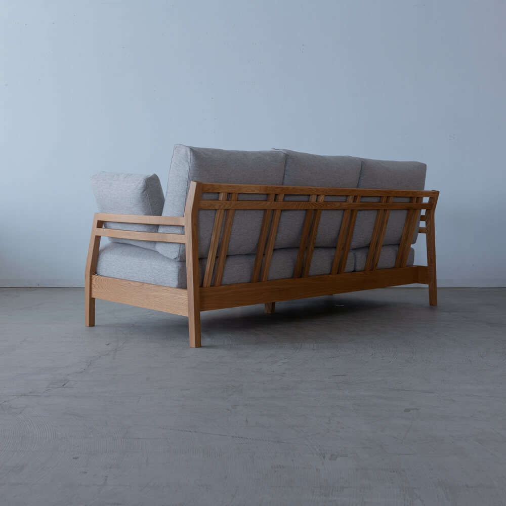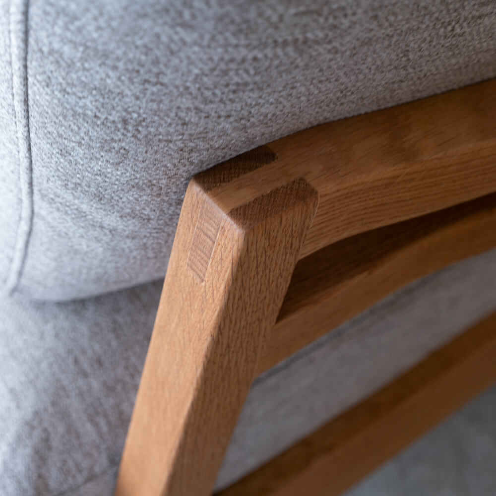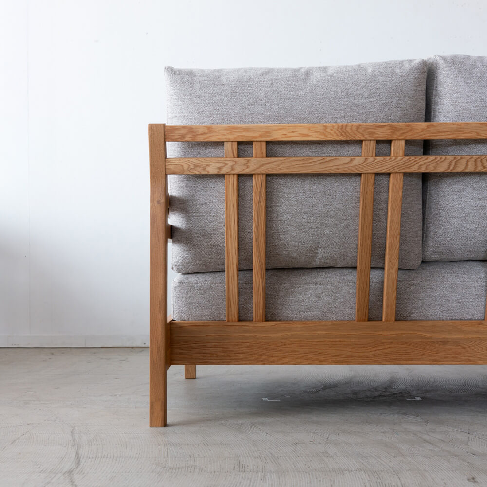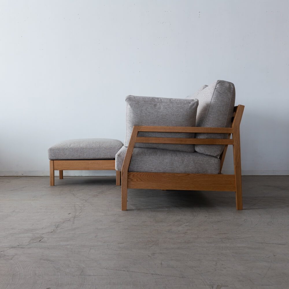 フレームには木目の美しいオーク材を使用。オイル仕上げによって自然な風合いを生かし、時間の経過とともに味わいが深まります。軽やかな脚元のデザインが、空間に抜け感をもたらします。脚は130〜190mmで、お掃除ロボット対応や立ち座りのしやすさも確保できます。