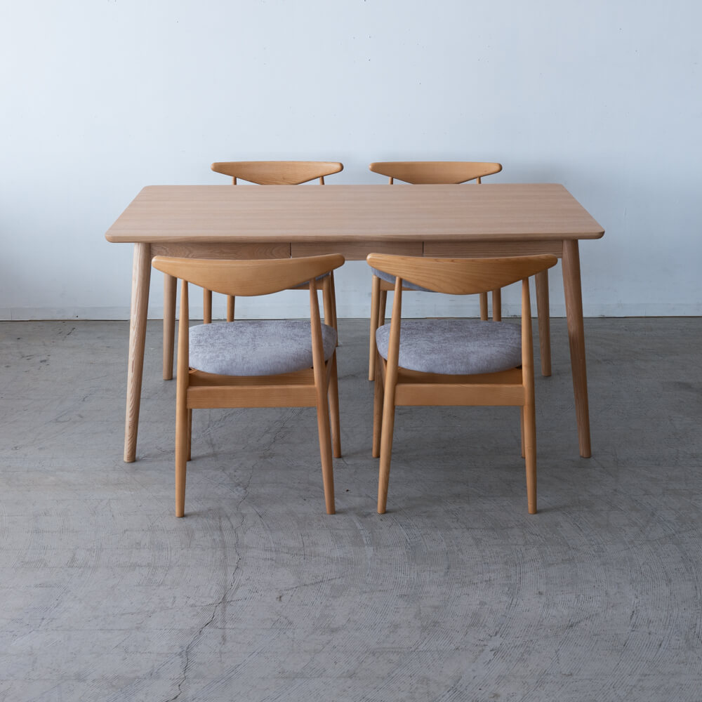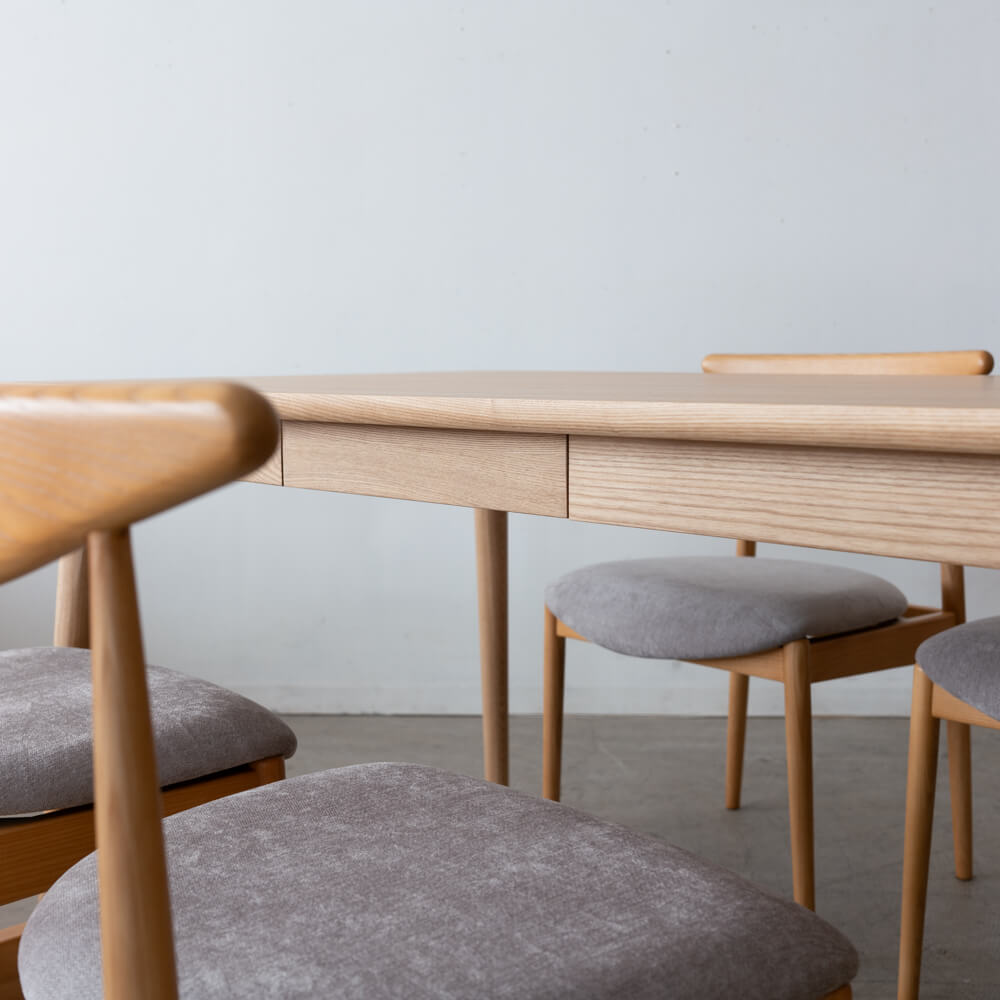 明るくやわらかなアッシュ材の風合いが、空間にやさしいぬくもりを添えるダイニング5点セット。テーブルには便利な引き出しが付いており、カトラリーやランチョンマットをさっと収納。シンプルなデザインと軽やかな印象で、北欧ナチュラルな空間づくりにぴったりのダイニングセットです。