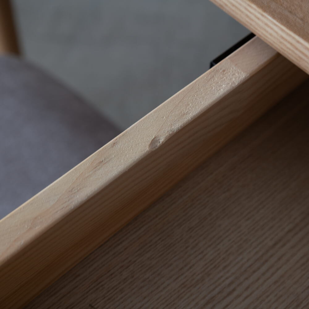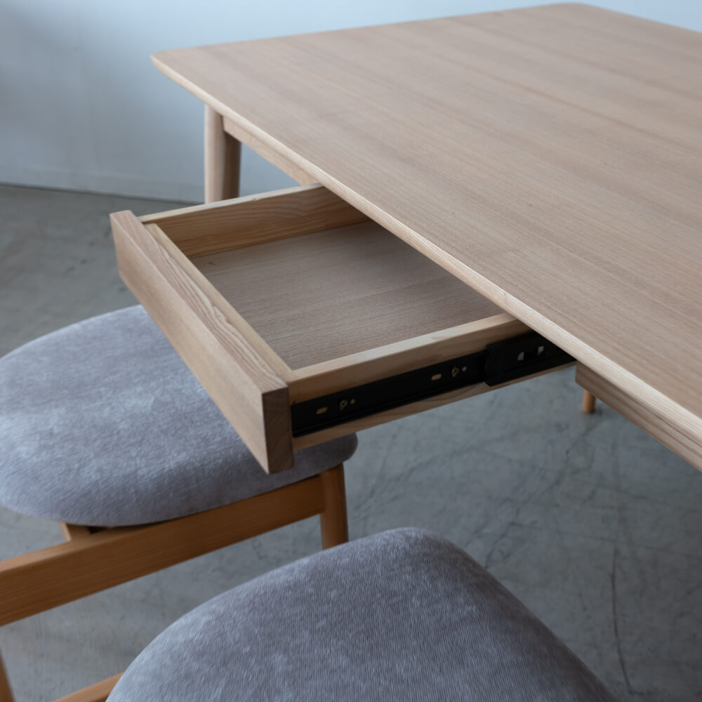 テーブルの片側には、約W345×D265×H50mmの引き出しを装備。カトラリーやランチョンマット、文房具などをスマートに収納できます。ダイニング以外にも、ワークスペース兼用テーブルとしても活躍します。