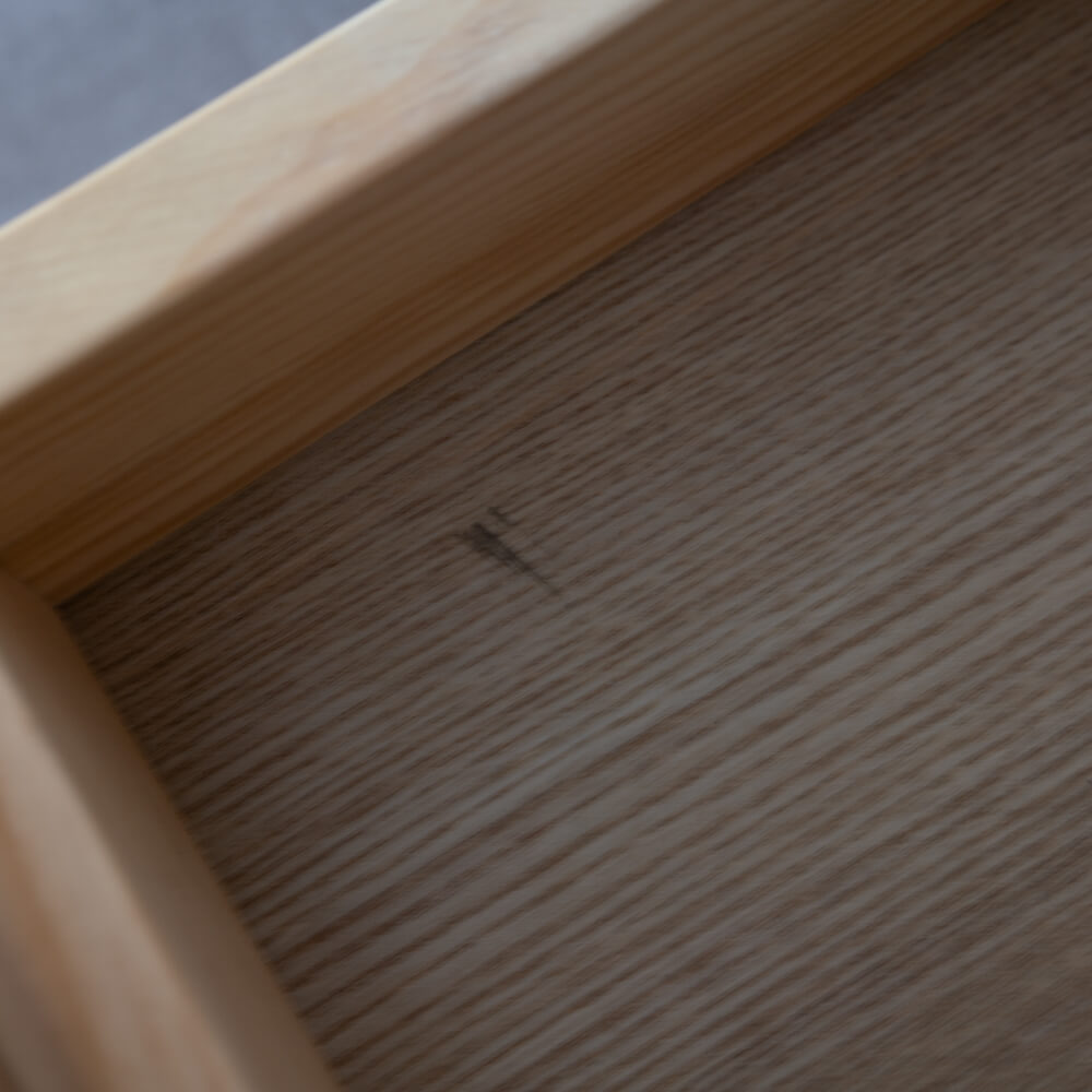 A. 天板の裏には“反り止め”が入っており、天然木特有の反りや歪みをできるだけ抑える構造になっています。天然木は季節や湿度の影響を受けやすい素材のため、わずかな反りが出ることがありますが、これは自然な経年変化のひとつ。木とともに時間を過ごす楽しみとしてお使いいただけます。
