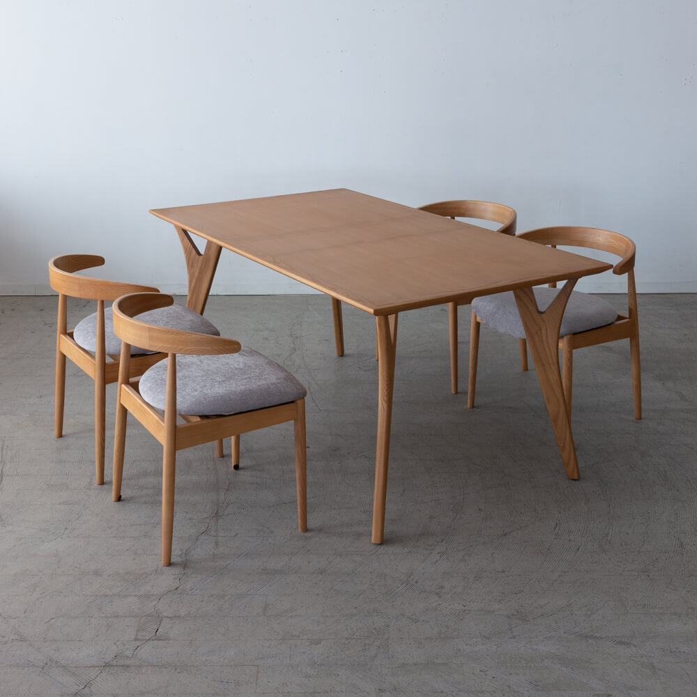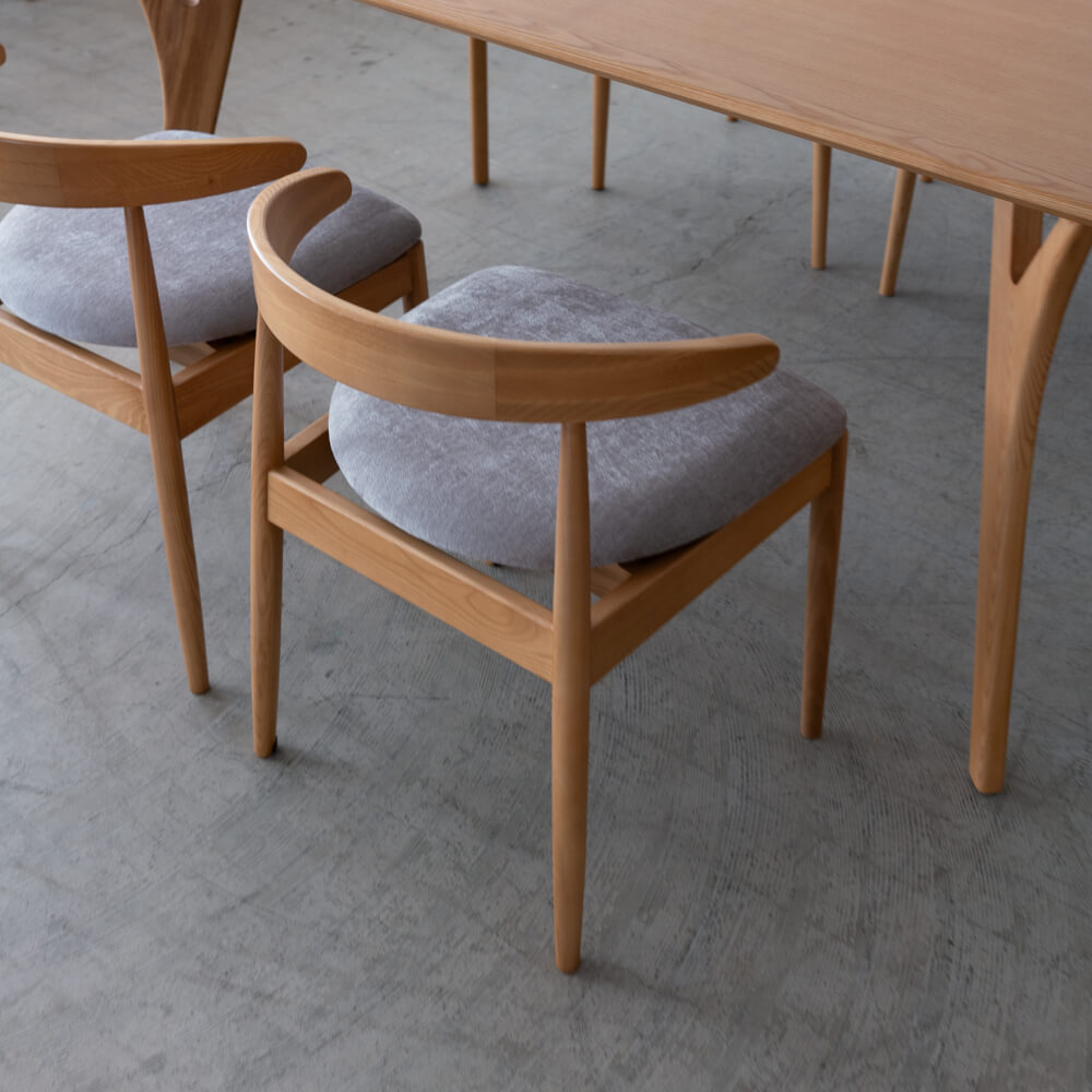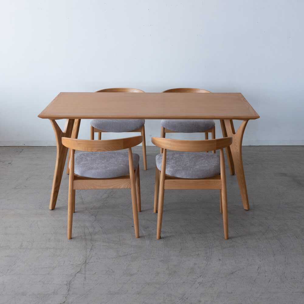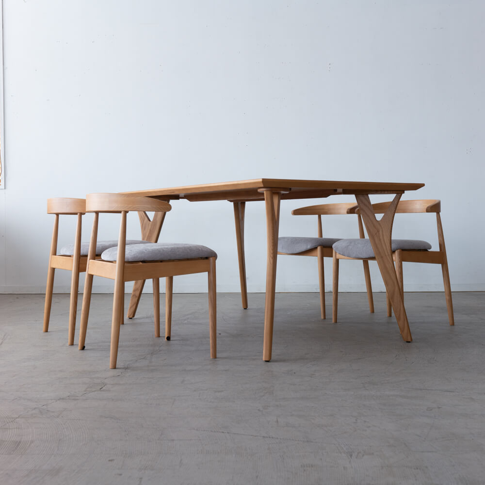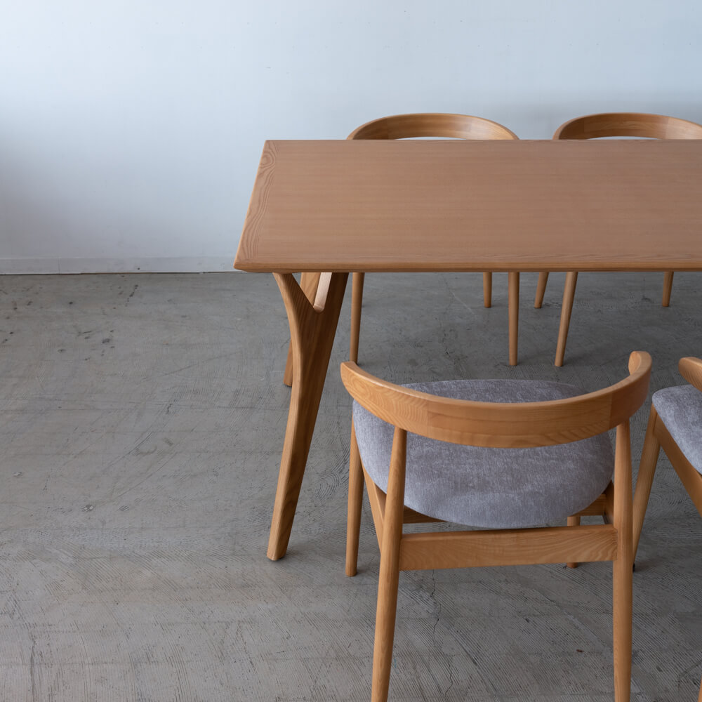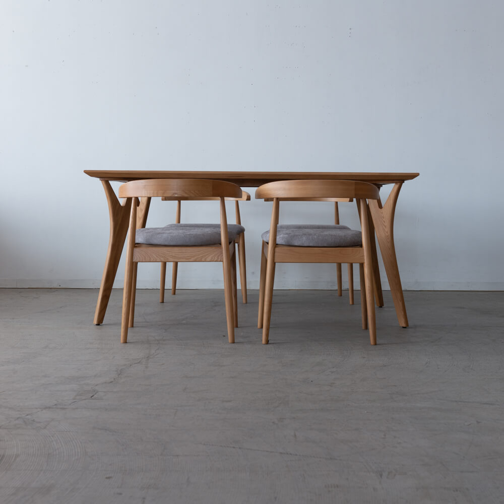 脚のデザインが印象的なテーブルに、背の曲線が美しいチェアを組み合わせた5点セット。ホワイトアッシュ材の明るい木肌を活かし、テーブルは自然系オイルでしっとりと、チェアはウレタン塗装で日常づかいに強く。やさしい触り心地と細部の丸みが、毎日の食卓を穏やかな空気で包みます。