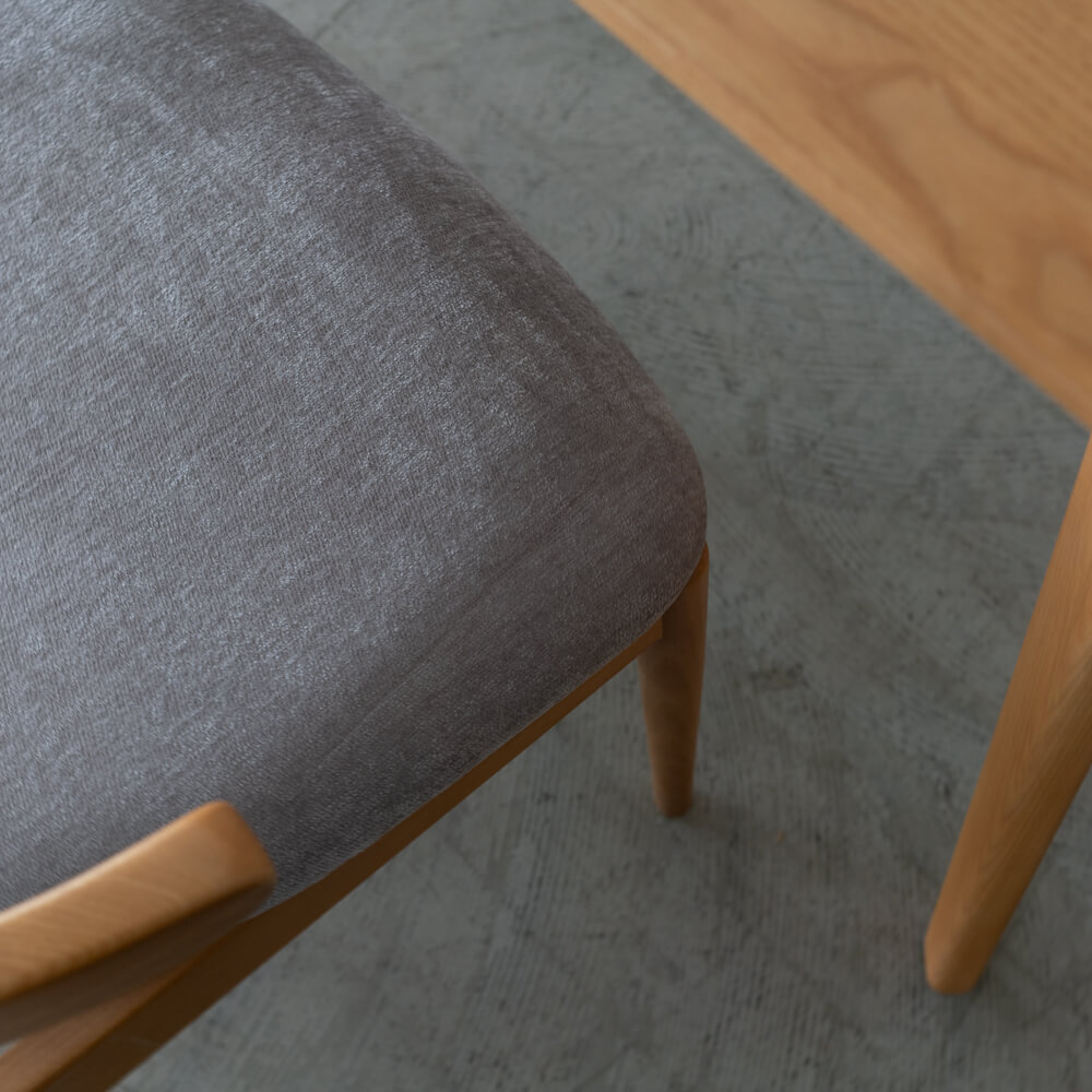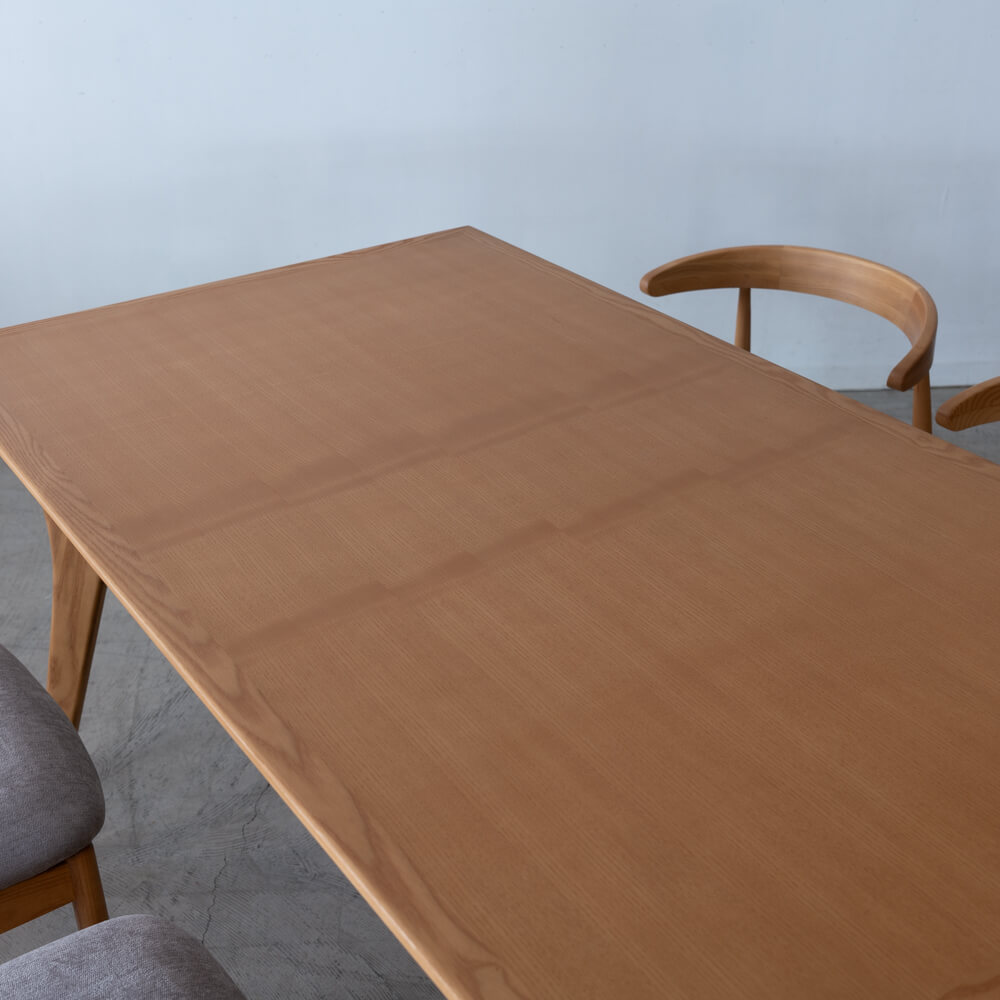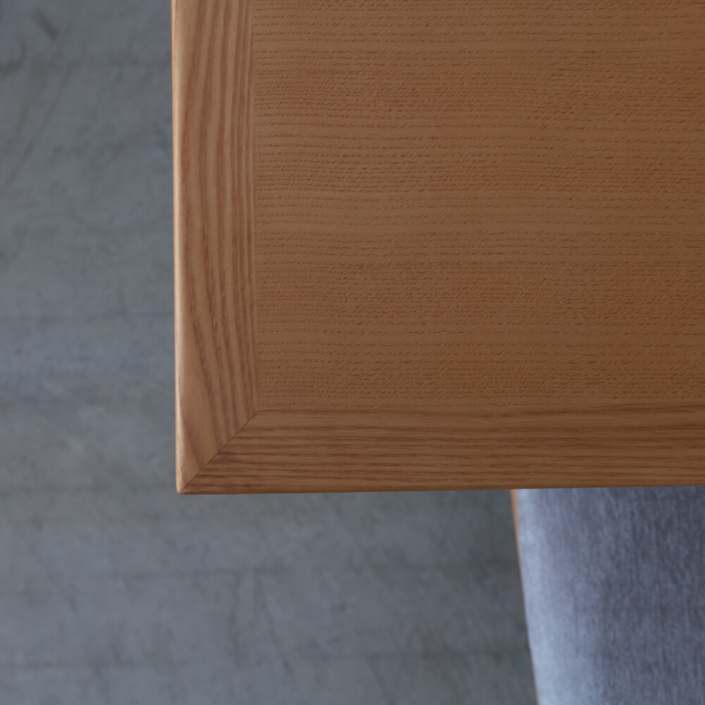 力強い導管とまっすぐな木目。テーブルは硬質塗膜を作らない自然系オイル仕上げで、木の呼吸と手触りをそのままに。使い込むほど艶が育ち、色味がやわらかく深まっていきます。(チェアはキズや汚れに強いウレタン塗装で、お手入れが簡単。)