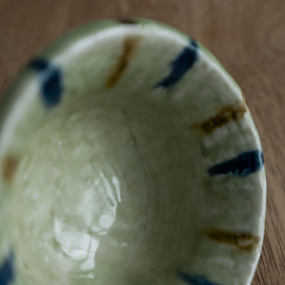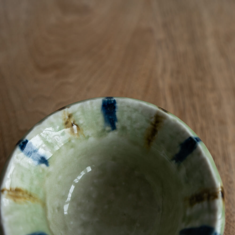 藍と飴のラインが均一ではなく、わずかに滲むことで手仕事のあたたかさを感じられます。整いすぎない“ゆらぎ”がこの器の魅力。まるで絵筆をすっと滑らせたような表情が、一つひとつに個性を与えています。