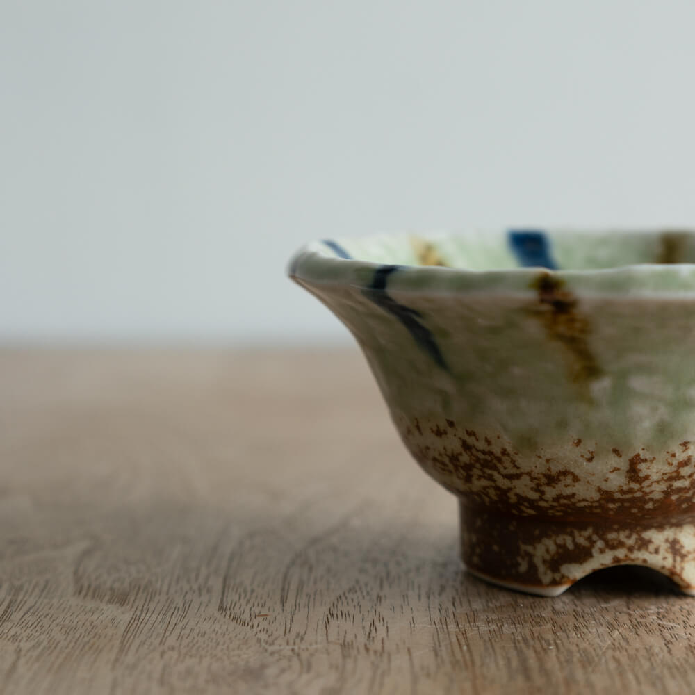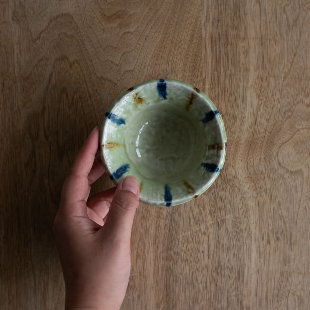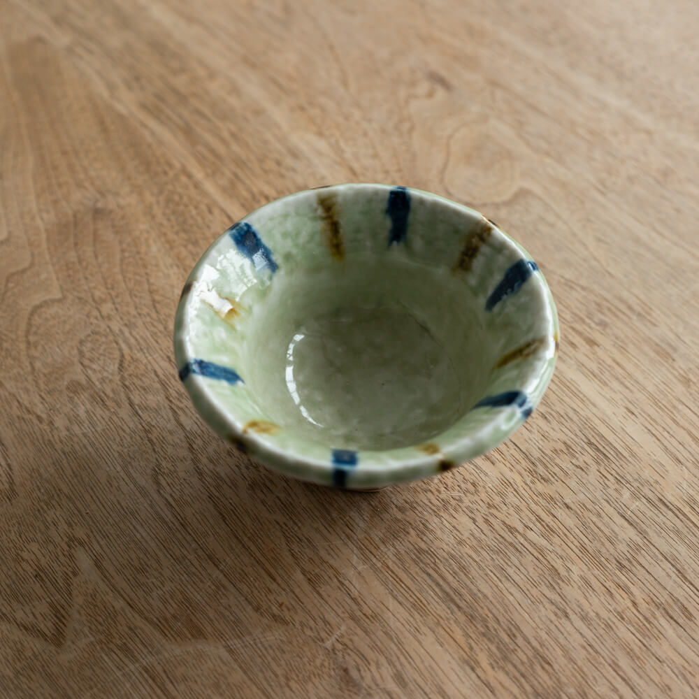 藍と飴の釉薬がやわらかくにじむ、十草模様の小鉢。ほんのり緑がかった地に、リズミカルな筆跡が映え、食卓に穏やかな風景を添えます。外側へふんわりと広がる反型のフォルムが、盛り付けた料理を美しく引き立てる一枚です。