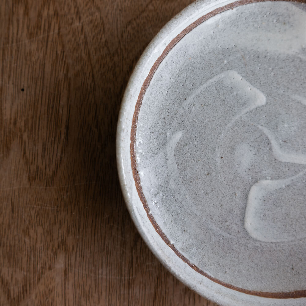 ほんのりとくすんだ灰白色の釉薬は、光の加減で表情が変化します。うっすらと見える刷毛目のような模様が、一枚ごとに異なる味わいを生み、料理をそっと引き立ててくれます。