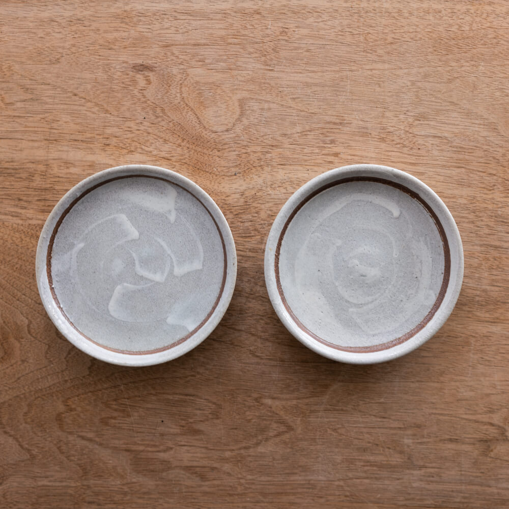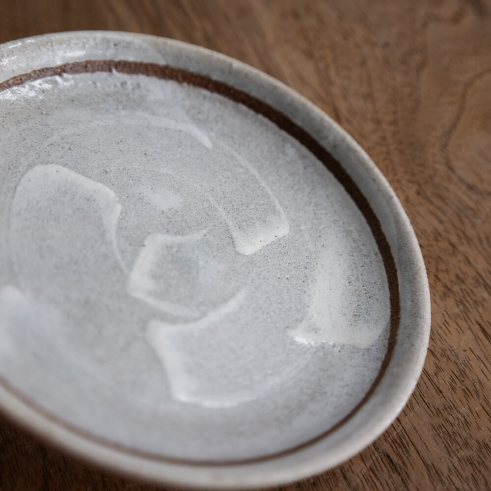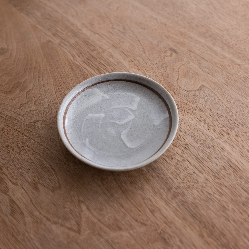 しっとりと落ち着いた灰白の釉薬に、リムの素地ラインがすっと映える小皿。控えめな佇まいながら、料理の彩りを上品に引き立ててくれます。毎日の食卓に自然と溶け込み、和にも洋にも馴染む万能な一枚です。