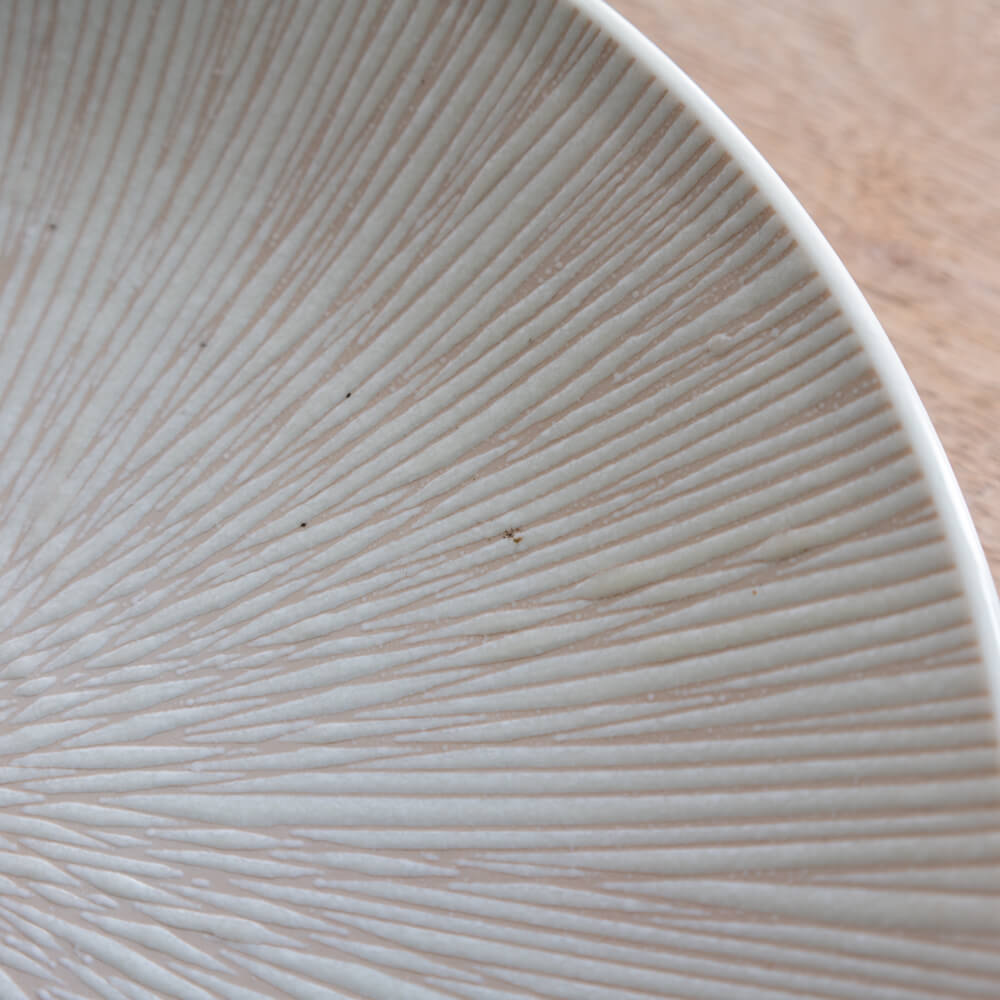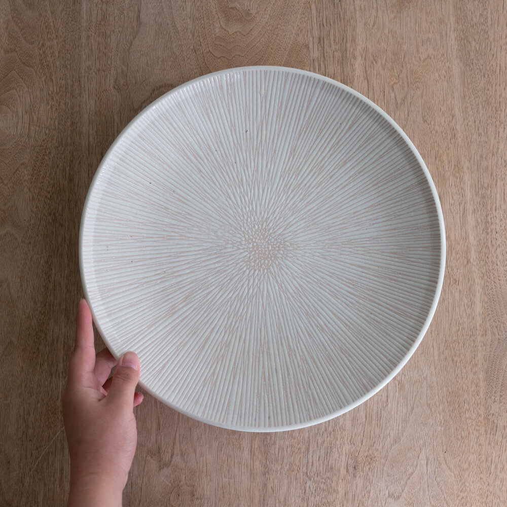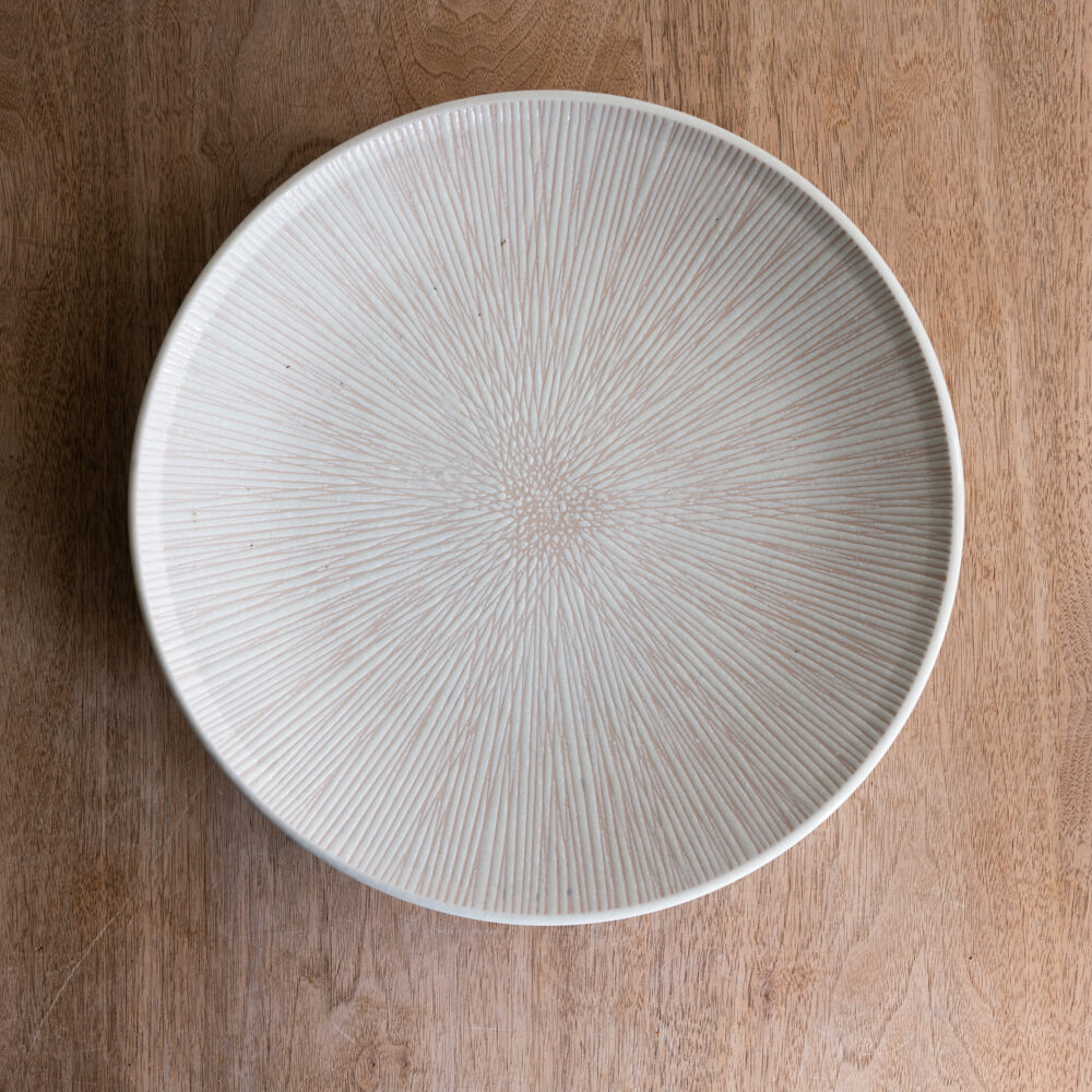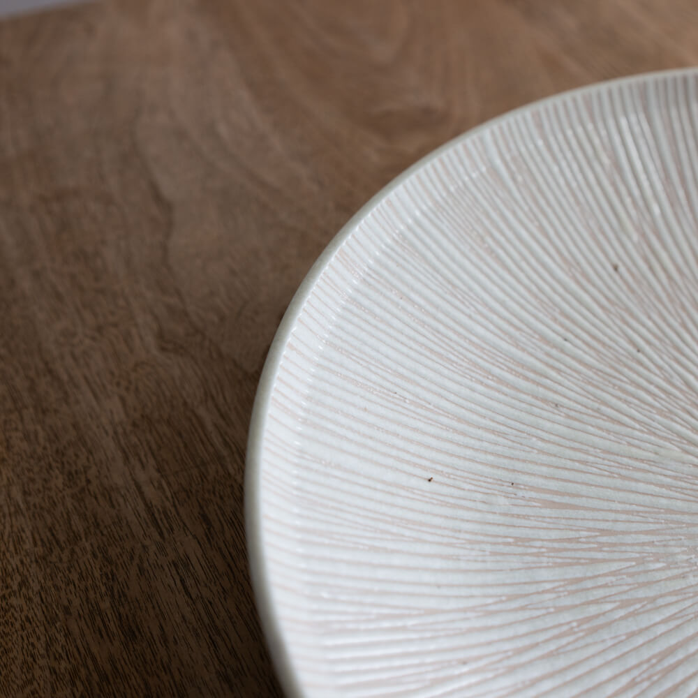 淡い白の地に、繊細な刻みが放射状に広がる大皿。光の角度によって表情を変える凹凸は、料理を自然と引き立て、食卓に穏やかな印象を添えてくれます。和洋を問わずどんな料理にも合わせやすく、特別な日にも、何気ない日常にも馴染む一枚です。