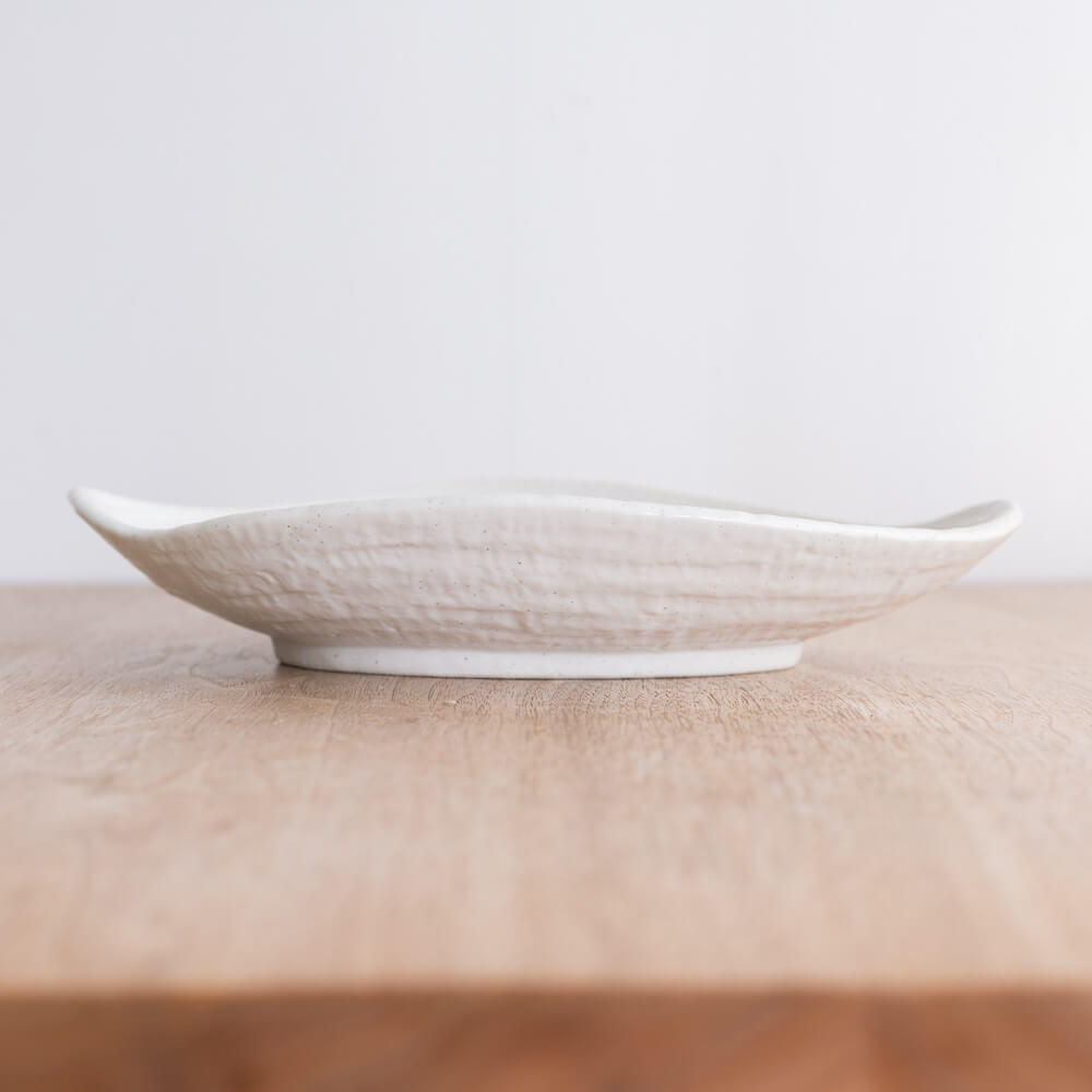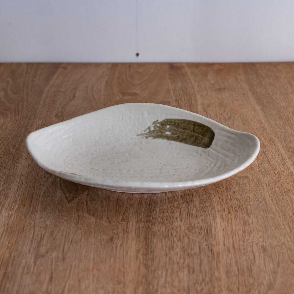 楕円に近い変形のラインが、盛り付ける料理に自然な“余白”をつくり出します。中央に向かってなだらかに立ち上がる形状が、料理を包み込むように受け止め、見た目もやわらかな印象に。