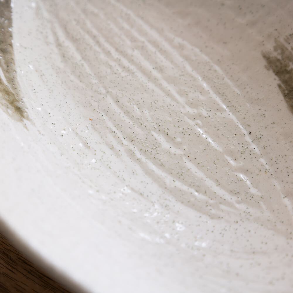 釉薬の下からうっすらと透ける素地の表情や、細かな黒点。均一ではない“ゆらぎ”が、量産品にはない温かみを感じさせます。
