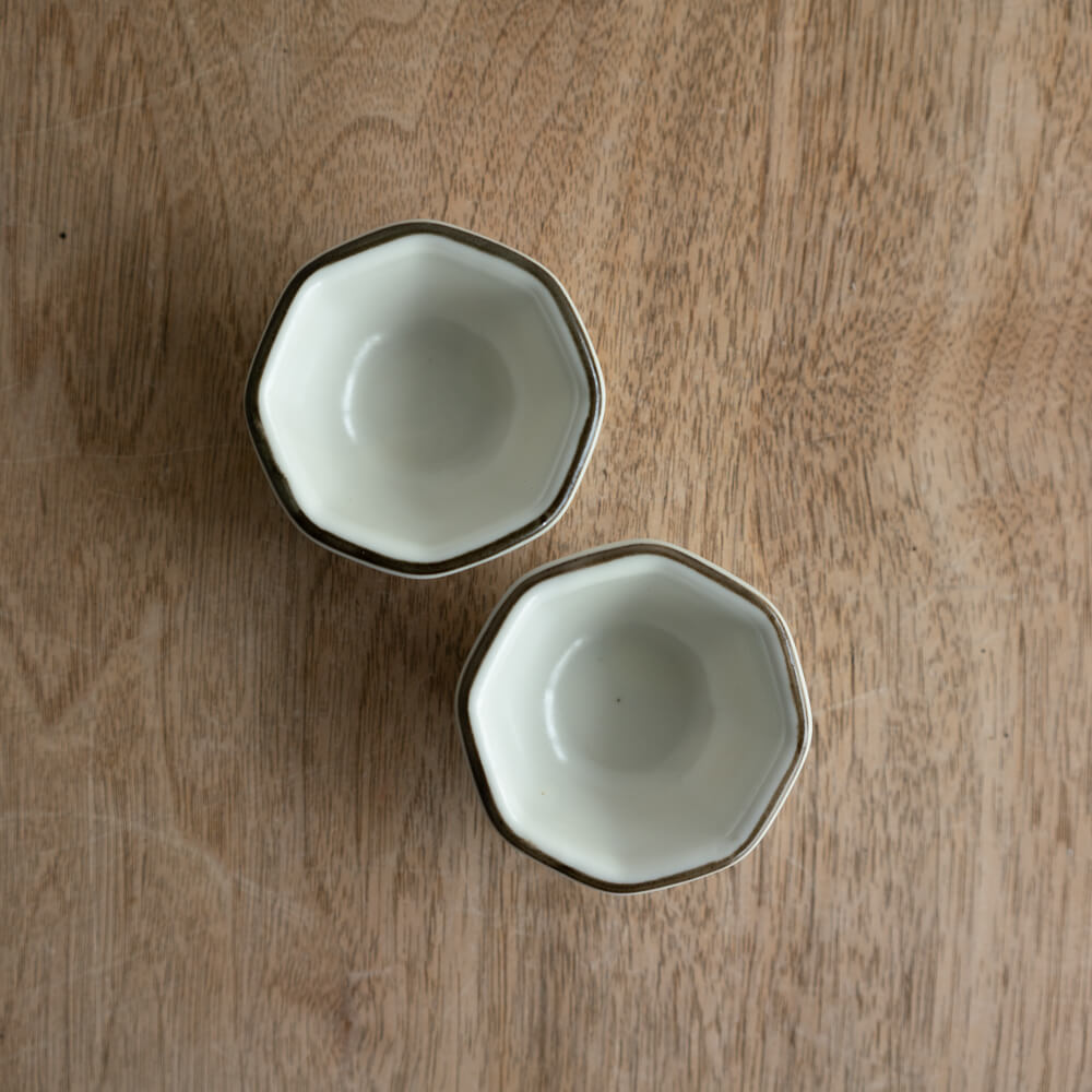 凛とした佇まいが魅力の小さな八角皿。わずか6cmほどのコンパクトなサイズ感ながら、料理を引き立てる力があります。前菜や薬味、珍味などを少し添えるだけで、和の食卓にさりげない品格と奥行きを加えてくれる一枚です。