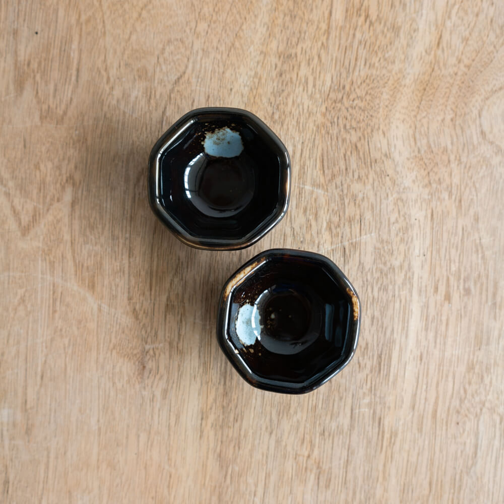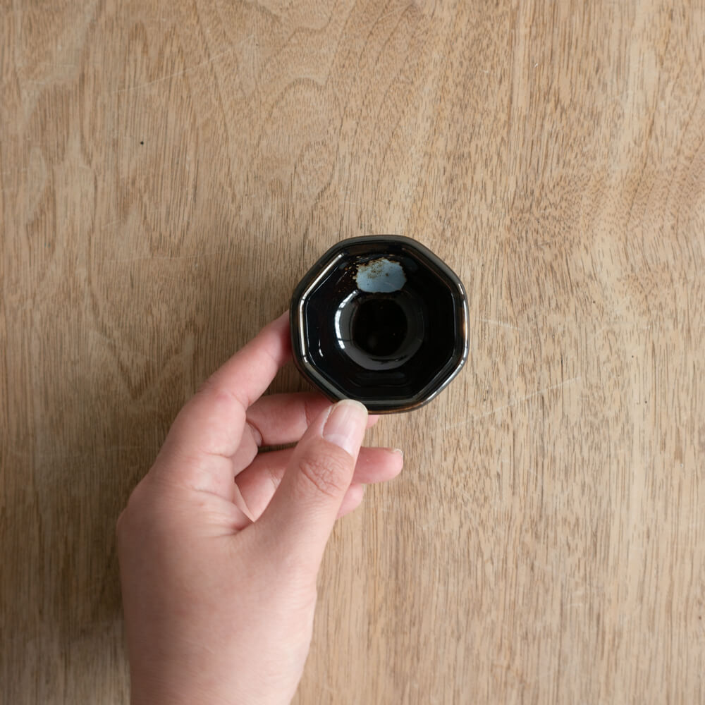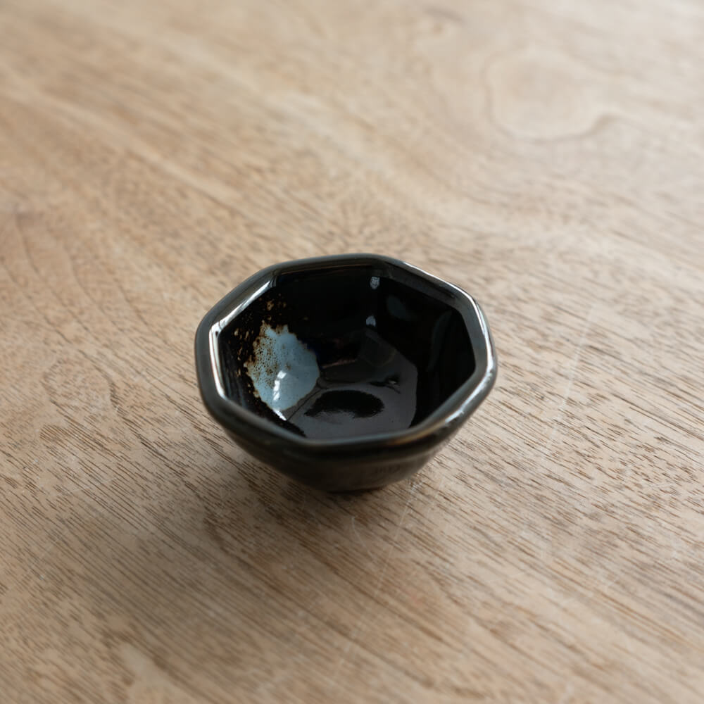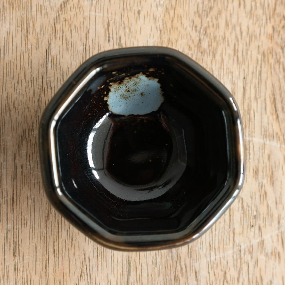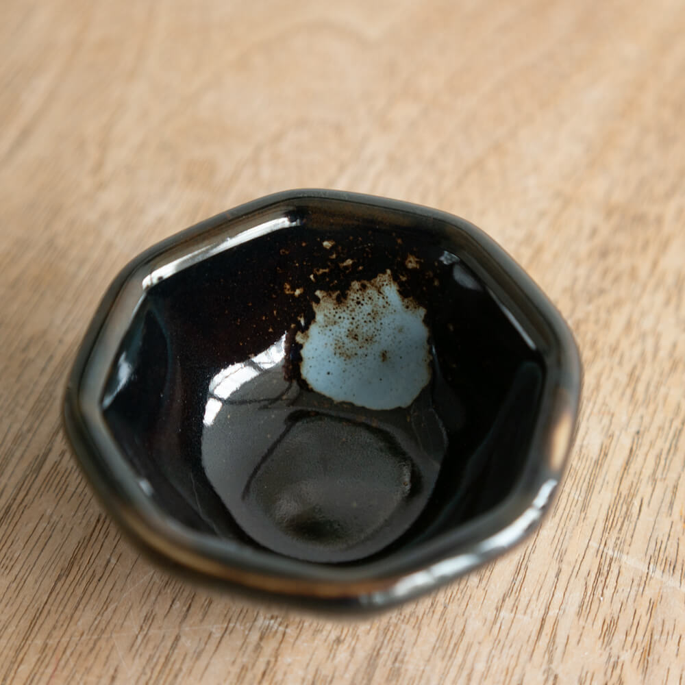 凛とした佇まいが魅力の小さな八角皿。飴釉のしっとりとした深みのある色合いに、水色の釉薬がさりげなく彩りを添えます。6cmほどのコンパクトなサイズ感ながら、料理を引き立てる存在感を放ち、和の食卓に上品な奥行きをプラスしてくれる一枚です。
