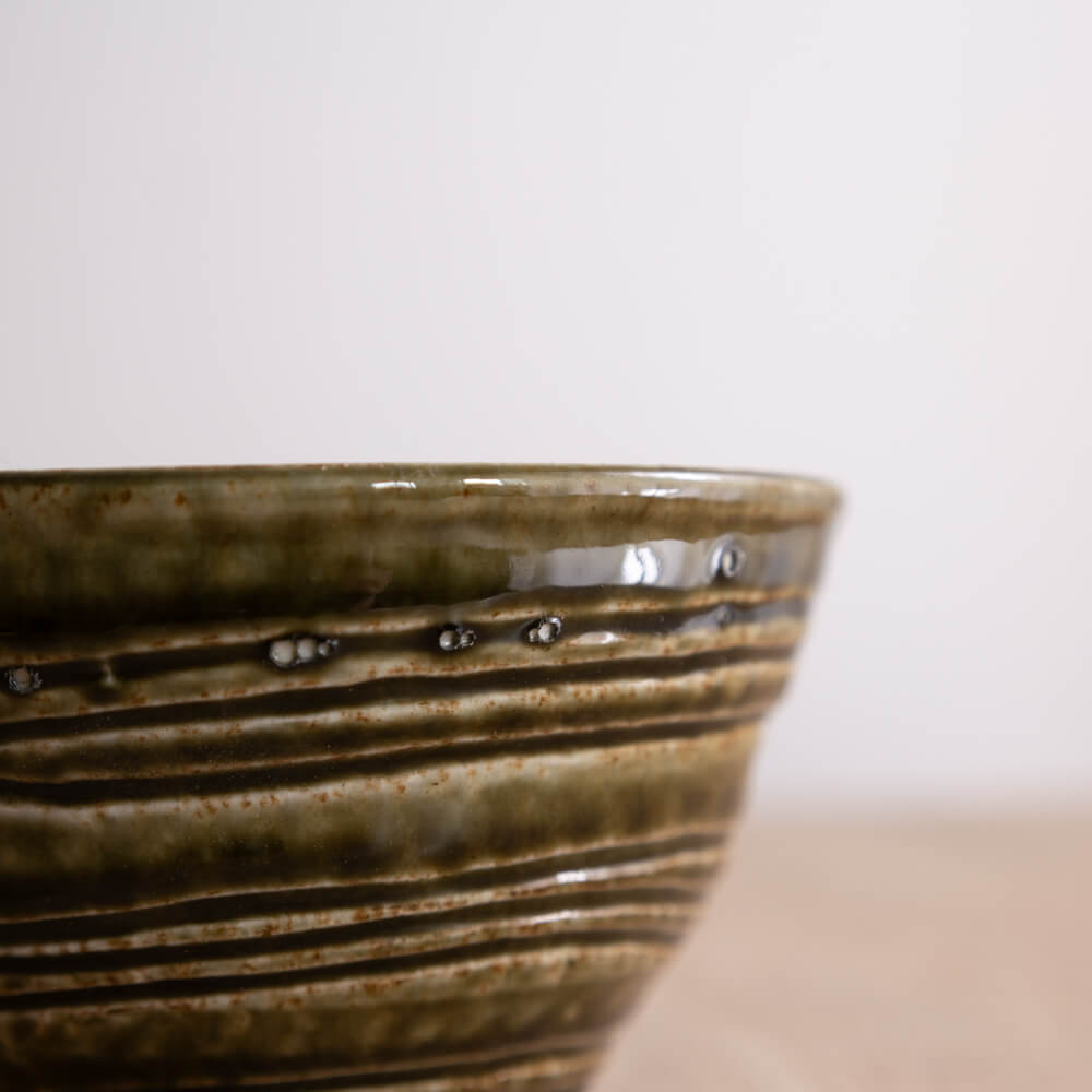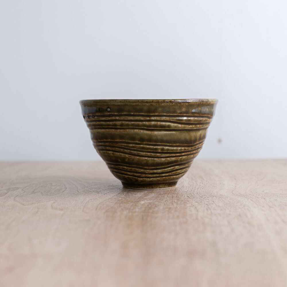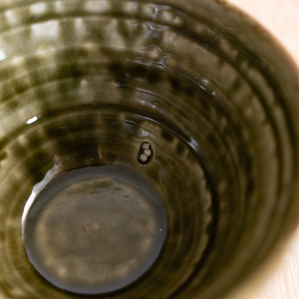 表面を覆う深い緑の釉薬には、焼成による自然な濃淡と流れが現れ、ひとつとして同じ表情がありません。器の側面に施された段模様が光を受け、釉薬の濃淡をより立体的に見せてくれます。