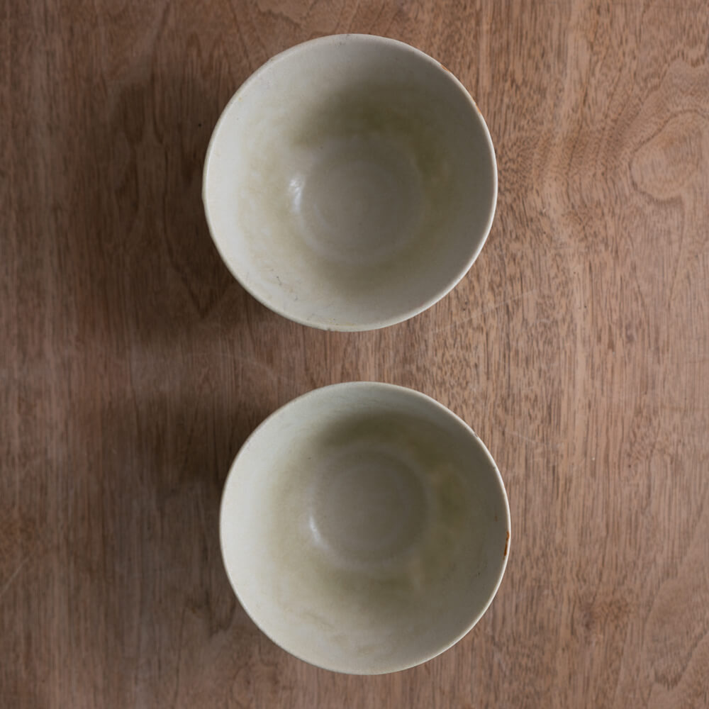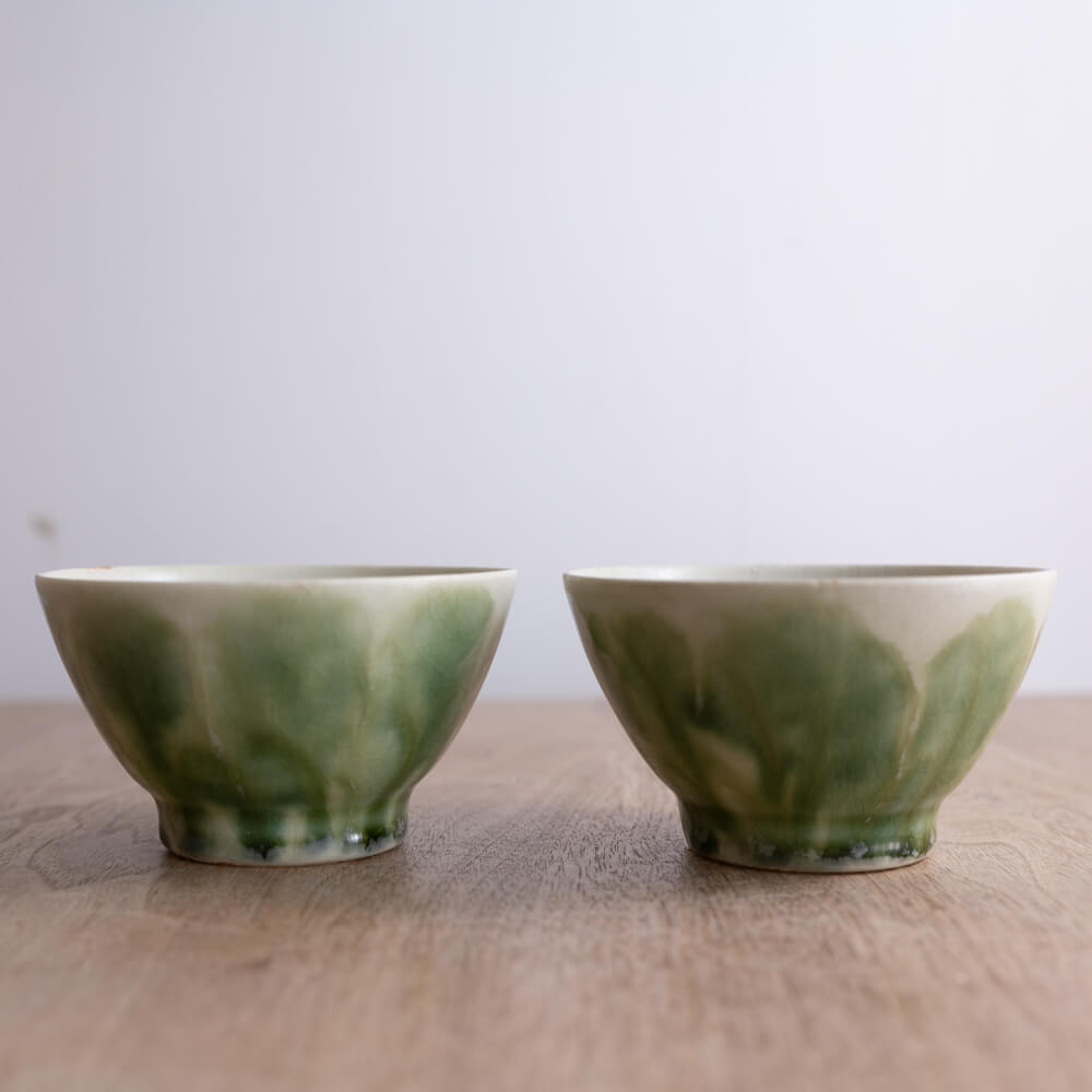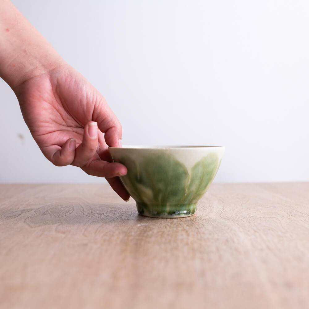 この茶碗の魅力は、釉薬が自然ににじみ合って生まれる柔らかなグリーン。濃淡が絶妙に広がる表情は、焼成の加減によってひとつひとつ異なります。手仕事ならではの風合いが、毎日の食卓にあたたかさを添えてくれます。