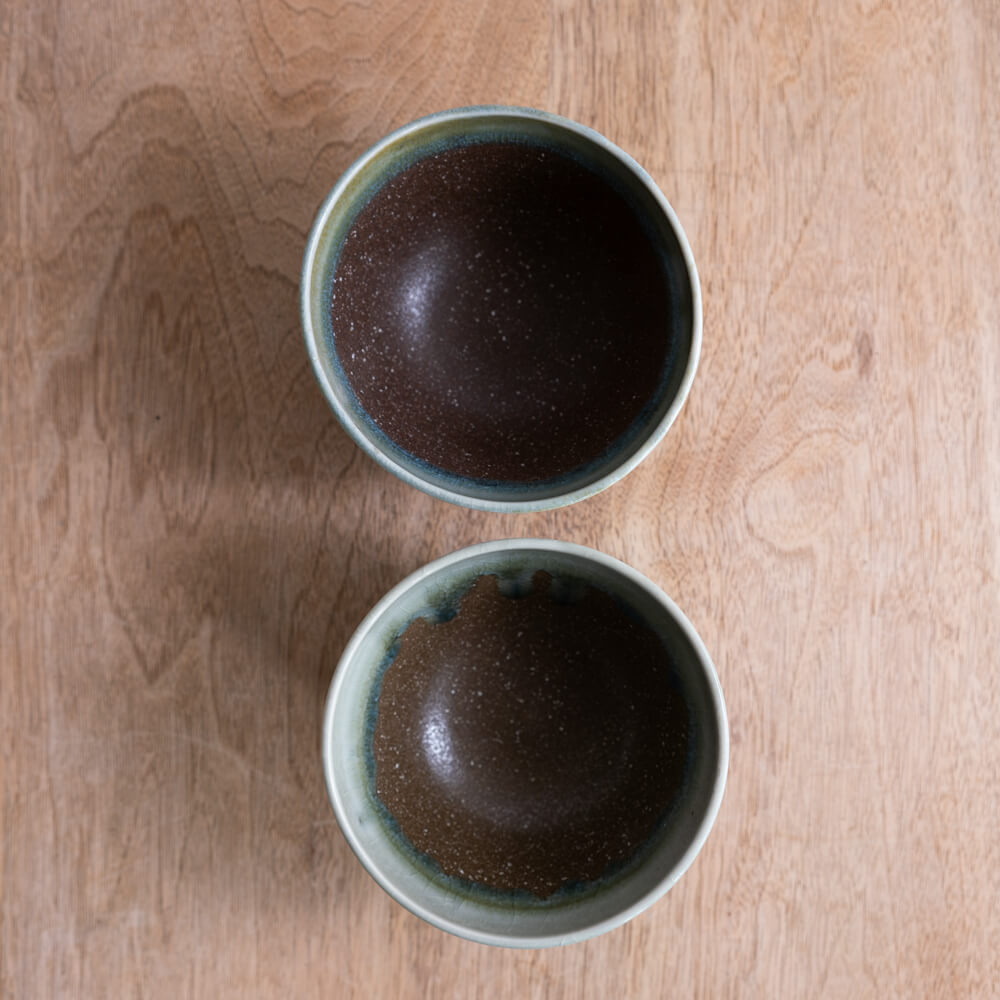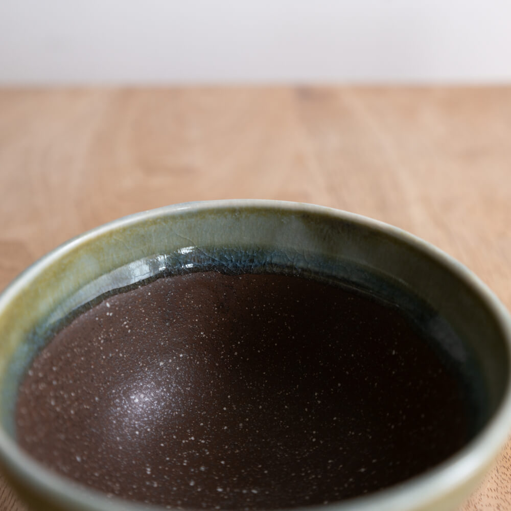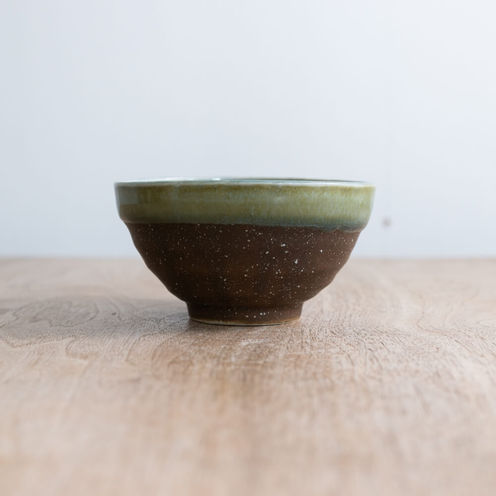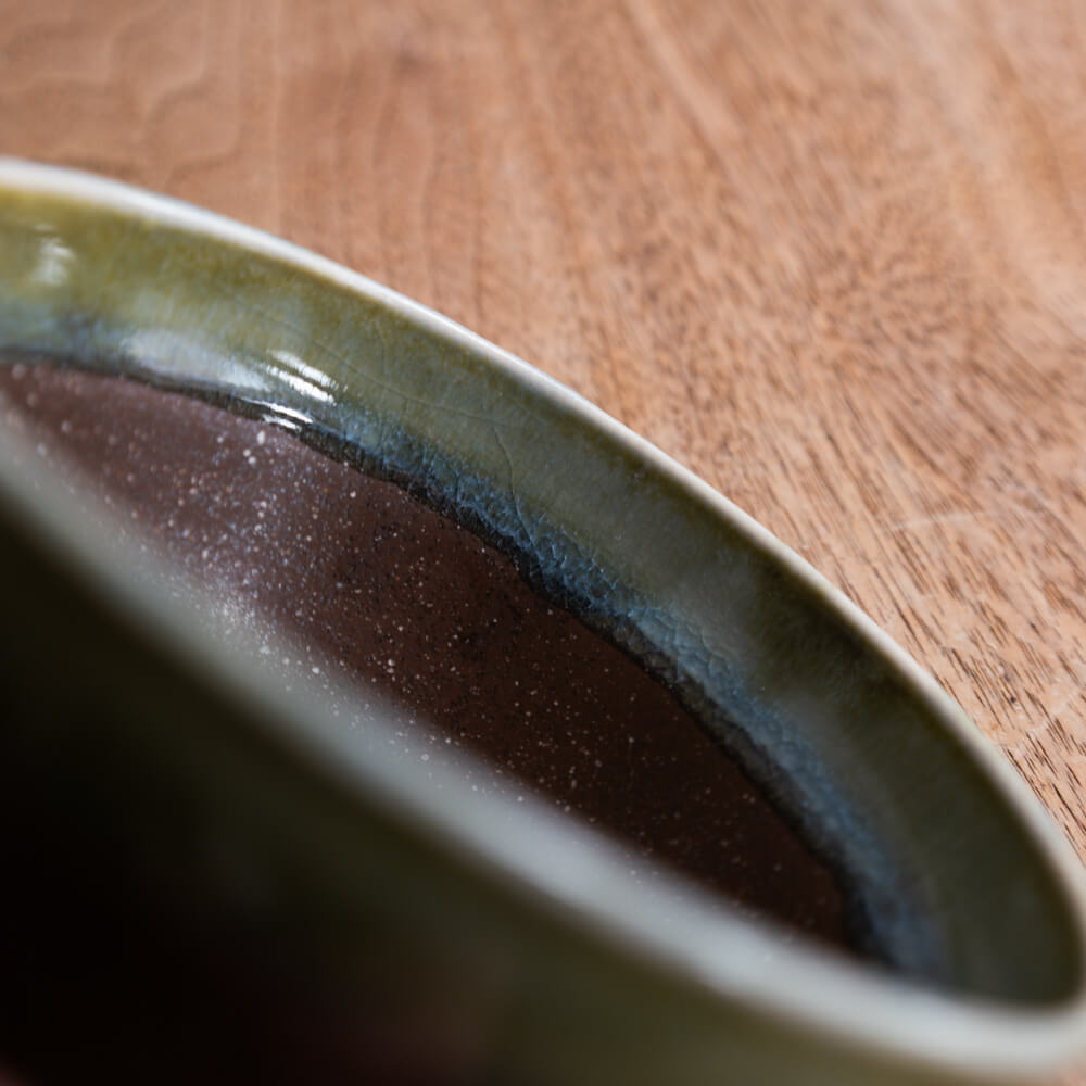 器の上部には艶やかに光を受け止める緑釉、下部にはざらりとした素地をそのまま残した土肌。ふたつの質感のコントラストが、シンプルな形に深みを与えています。手に取ったときの感触の違いも心地よく、器を“使う時間”そのものを豊かにします。