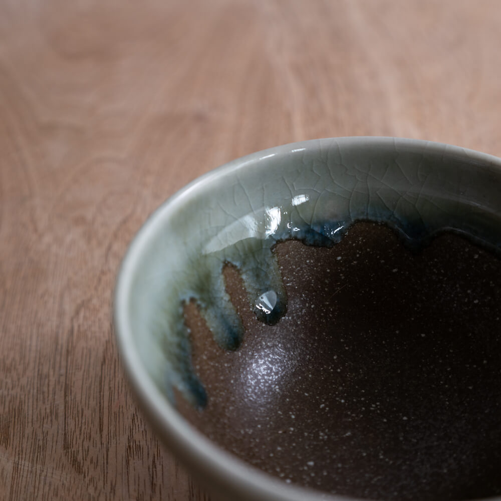 手に取った瞬間に伝わる、釉薬のしっとりとした艶と、土肌のざらりとした素朴さ。その異なる質感が響き合い、和の趣を深く感じさせてくれる茶碗です。釉薬の自然な垂れ模様と、貫入のひび模様が生み出す奥行きある表情は、ひとつとして同じものがありません。普段の食卓にさりげなく“特別感”を添えてくれる一品です。