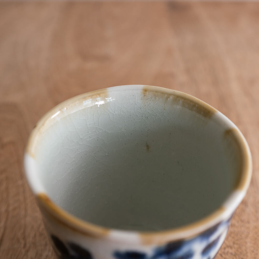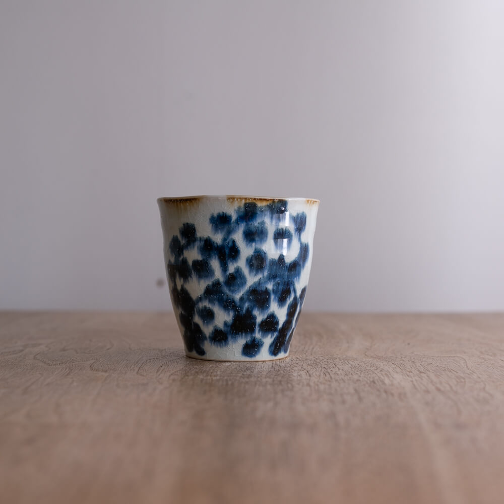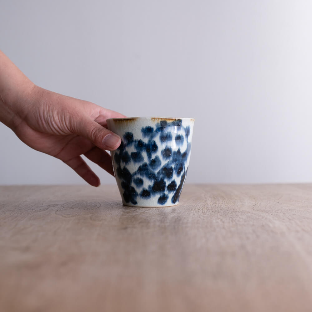 φ9×h8.8cmというサイズは、湯呑みやそば猪口、デザートカップなど幅広い用途に対応。朝の一杯のコーヒーやほうじ茶にもぴったり。持ちやすいフォルムが手にやさしく馴染み、朝の始まりを穏やかにしてくれます。白い陶肌と藍の模様がスイーツの色を引き立て、テーブルを華やかに彩ります。