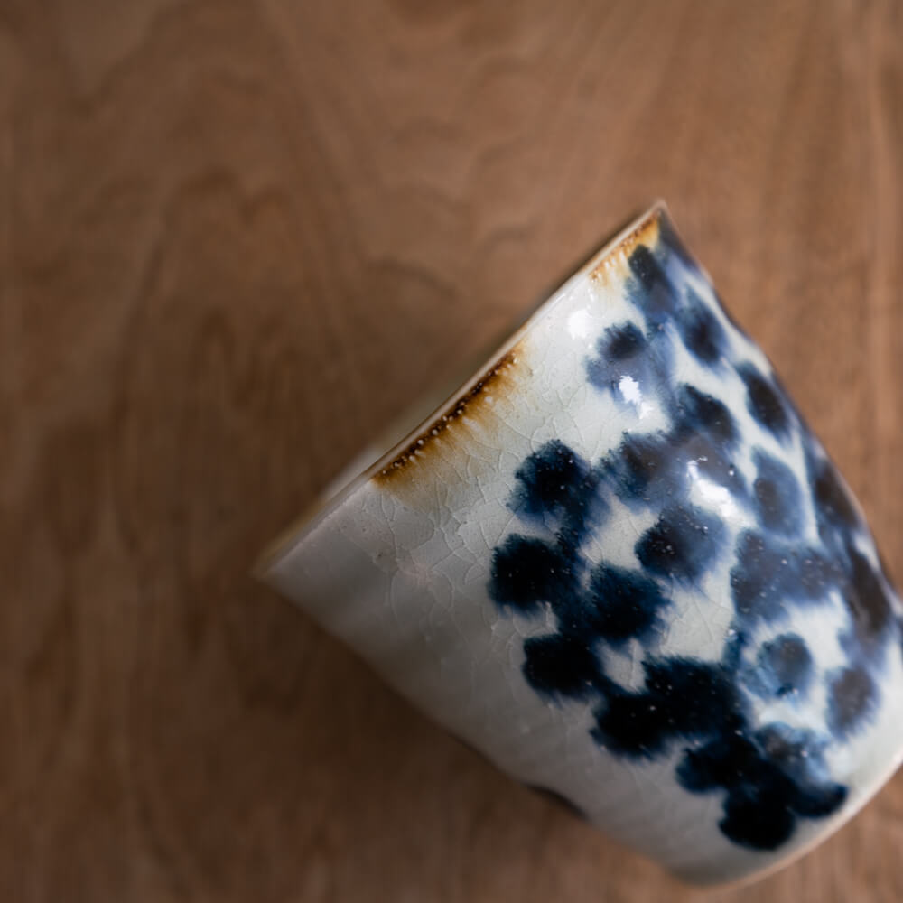 ふとした時間に手に取りたくなる、やさしい藍のカップ。滲むような藍と、縁をぐるりと包む飴色の釉薬が、ほっとするような温もりを生み出します。朝のコーヒーやお茶時間、夜のくつろぎの一杯にも。使うほどに貫入が育ち、暮らしに馴染んでいく——そんな“日常の相棒”になる器です。