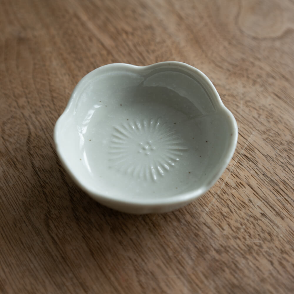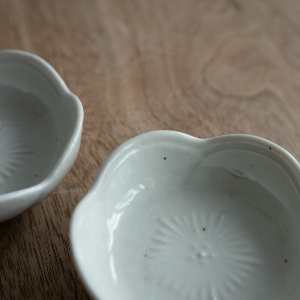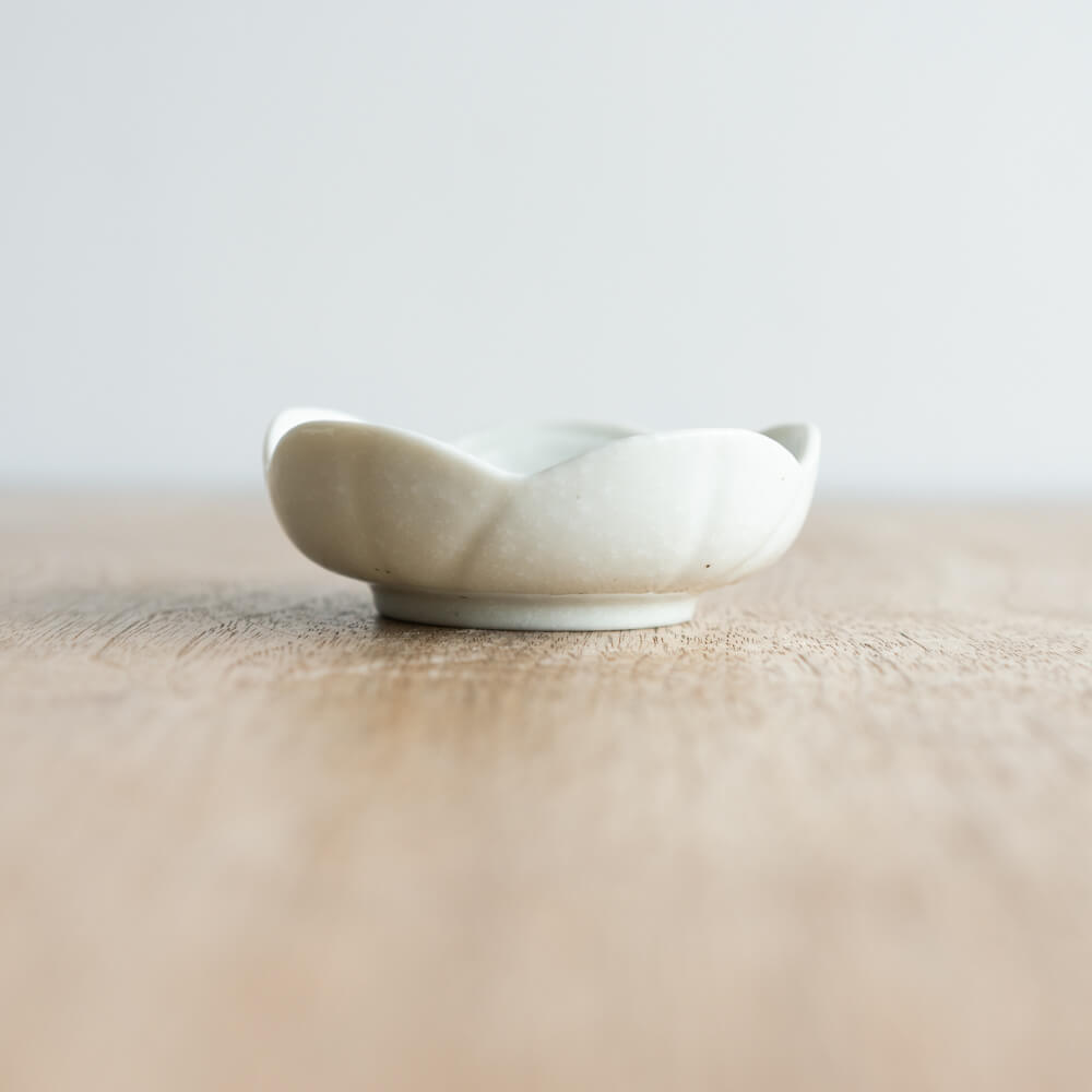 やわらかな白釉とふっくらとした花型のフォルムが、食卓にそっと華を添える豆皿。小ぶりながらも上品な存在感があり、日常づかいからおもてなしまで幅広く活躍します。料理を引き立てる“やさしい白”が、テーブル全体を明るく上品に見せてくれます。