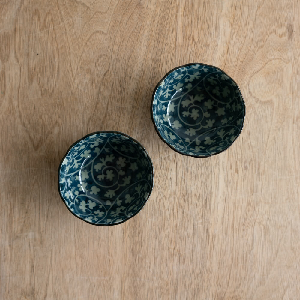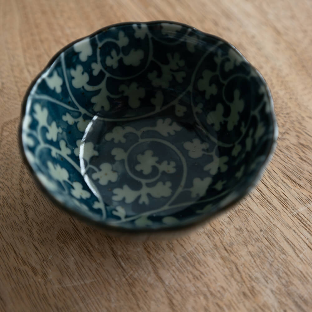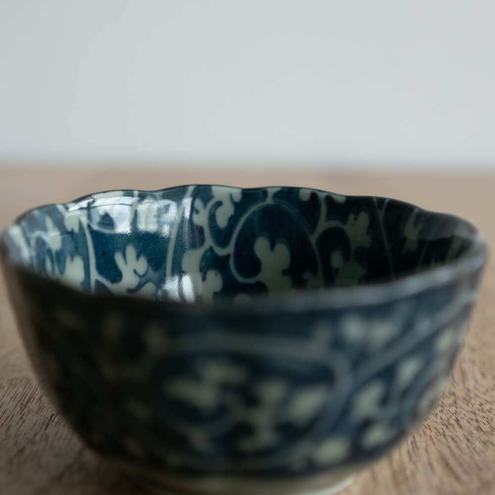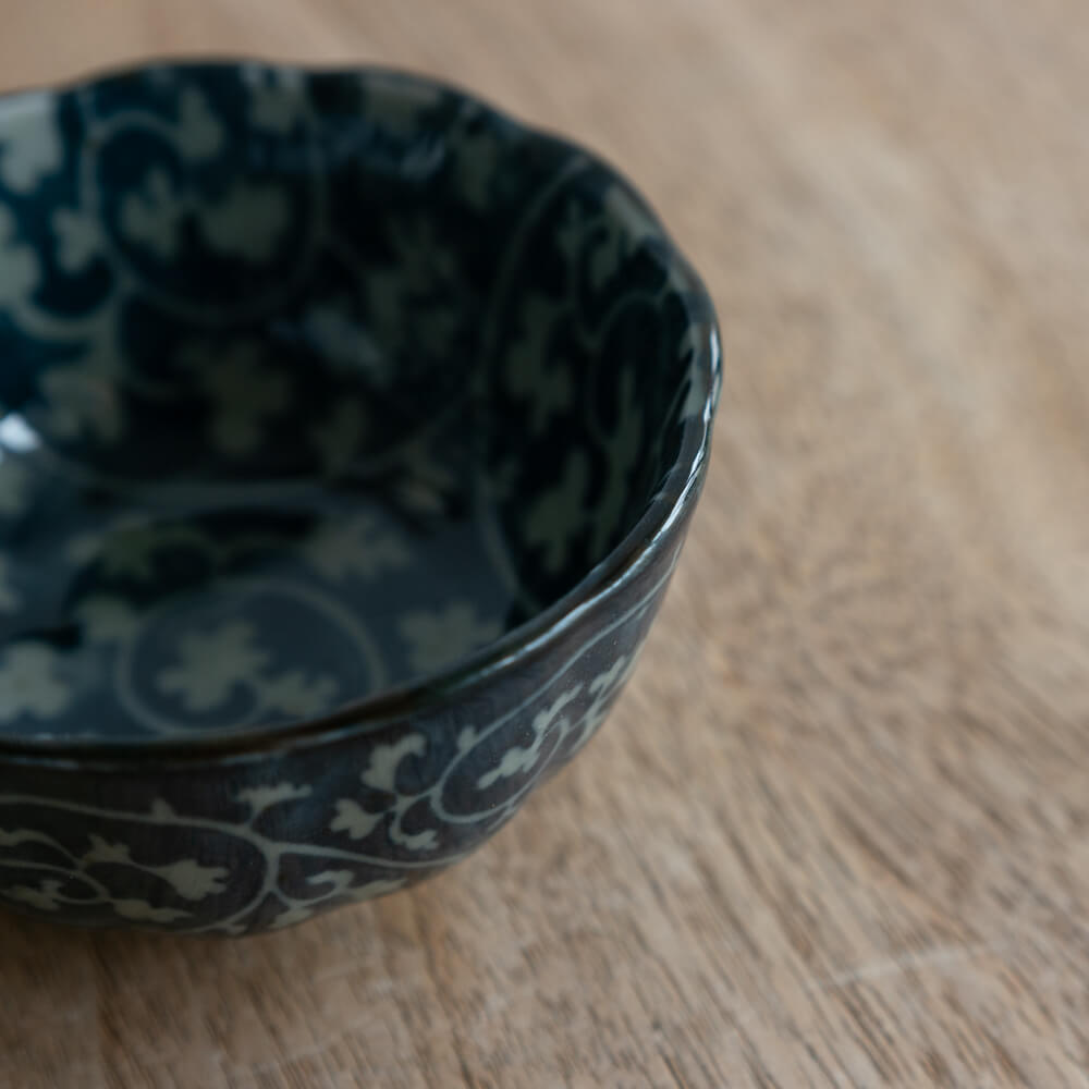 深い藍に映える唐草模様と、梅の花のようにやさしく波打つ縁取り。小ぶりながらも、食卓の印象をぐっと引き締めてくれる存在感のある豆鉢です。和の趣と上品さをあわせ持ち、日常にもハレの日にも自然に馴染みます。