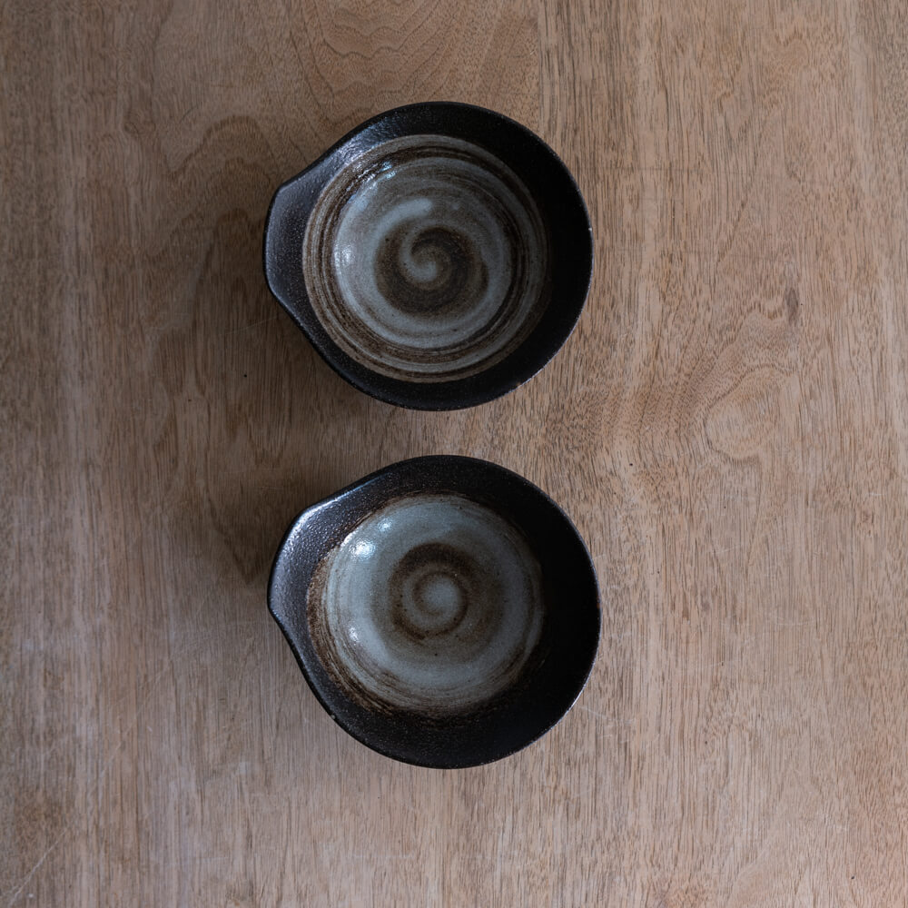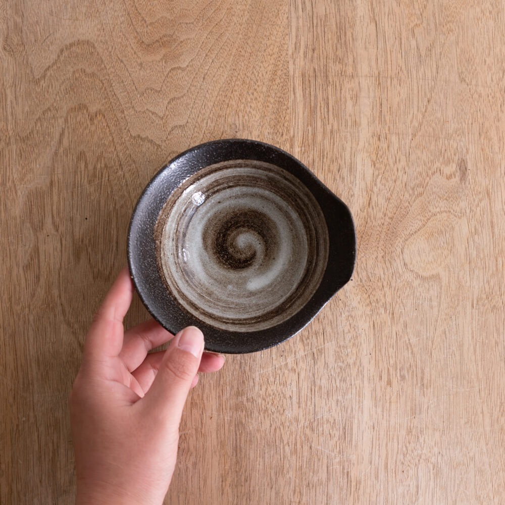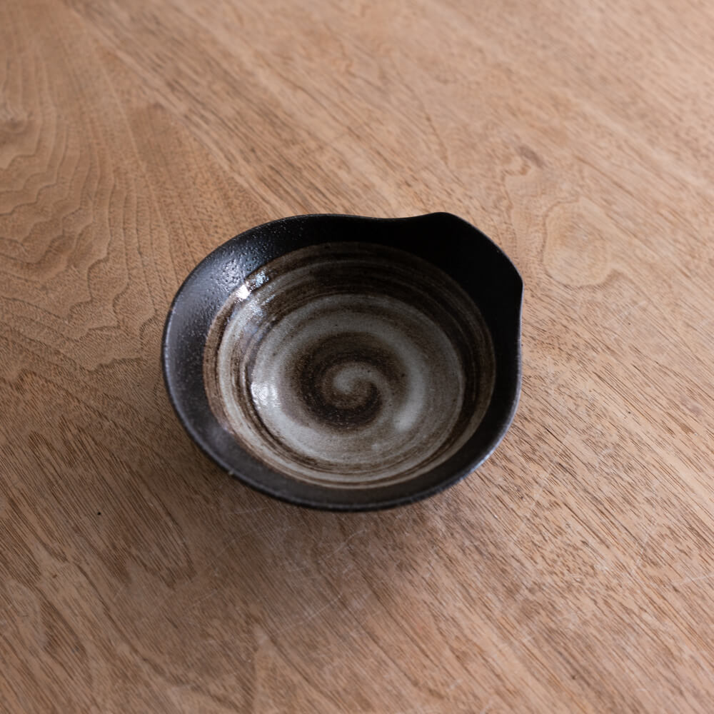 深みのある黒釉とほわっと渦を描く模様が印象的な呑水。無駄のないフォルムと落ち着いた色合いが、料理を主役に引き立てながらも、食卓に凛とした存在感を添えます。小ぶりながらも印象に残る佇まいで、和洋どちらのシーンにも自然に馴染む器です。
